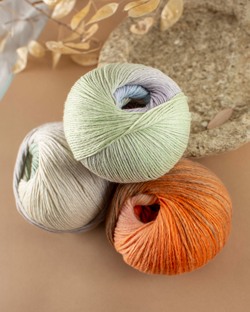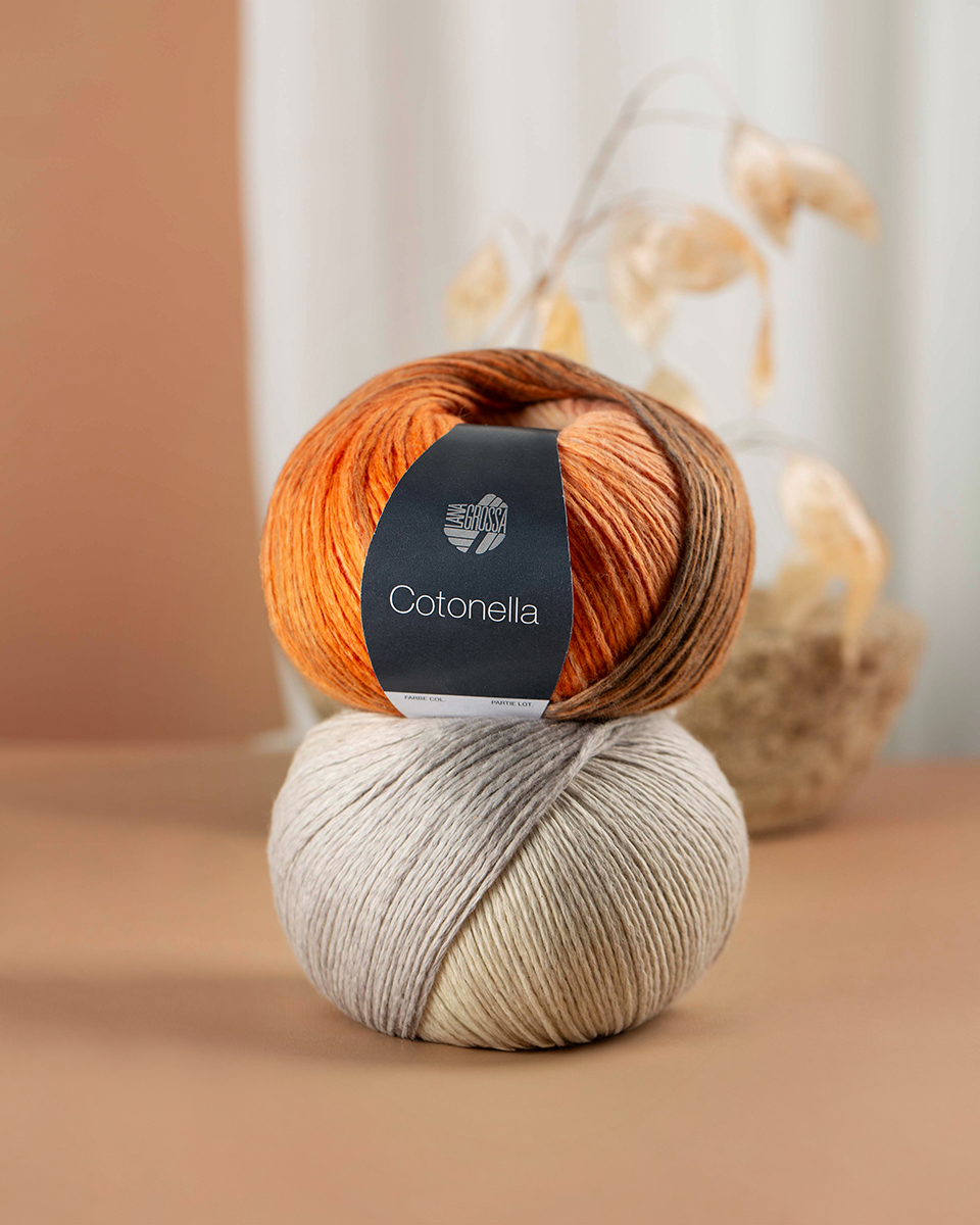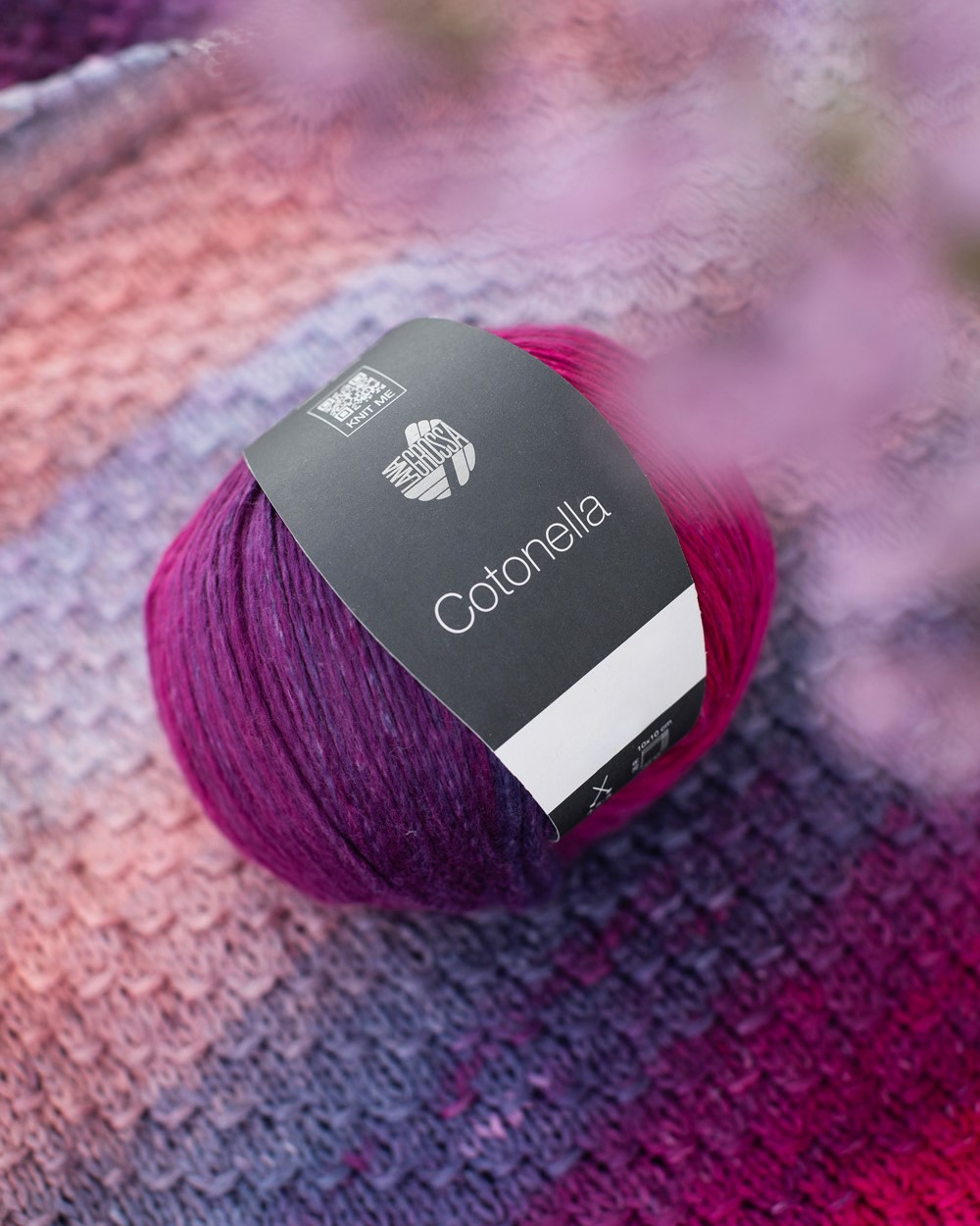 Cotonella — это мягкая летняя пряжа из 100 % хлопка с особым шармом: благодаря деликатному цветовому переходу в технике spray-dye при вязании формируется живое, слегка меланжевое полотно — без необходимости менять нити. Приятная на ощупь и гипоаллергенная, Cotonella идеально подходит для летних свитеров, топов, шалей и детских моделей.