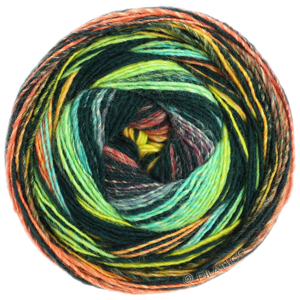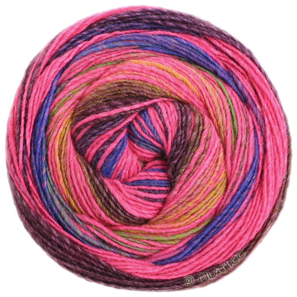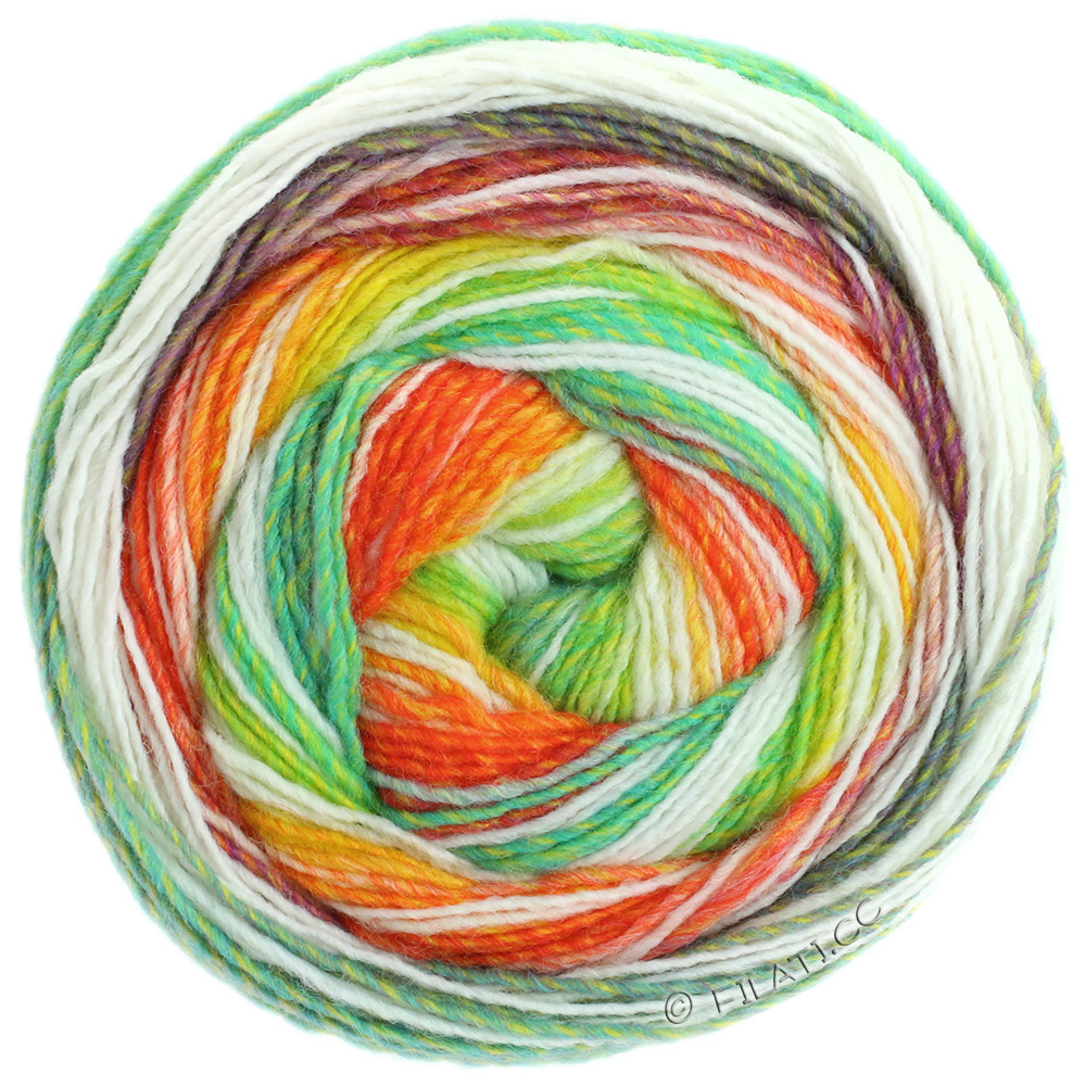 Слегка скрученная пряжа с яркими, гармоничными цветовыми градиентами, которые разбиваются поразительными полосами