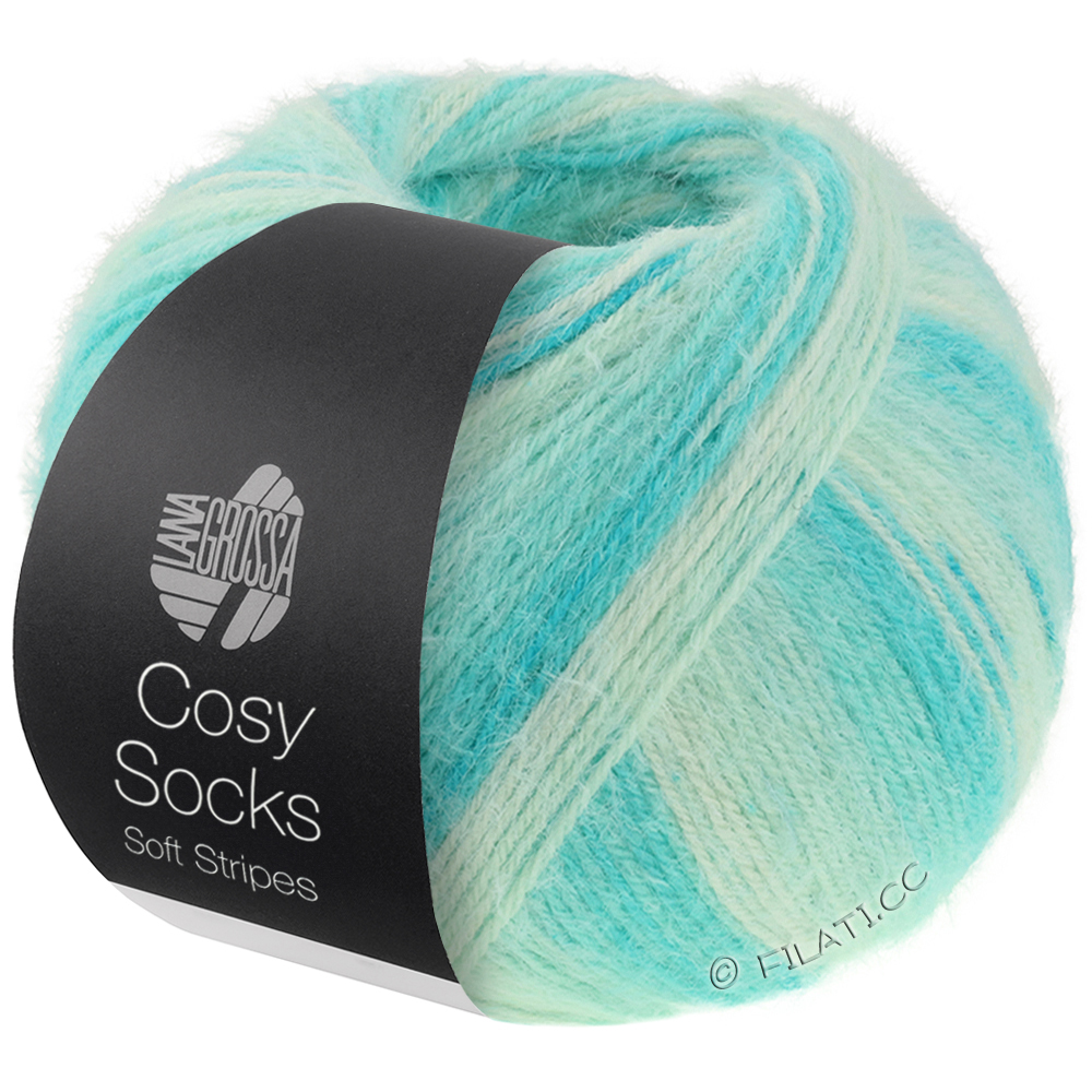 С Cosy Socks Soft Stripes от Lana Grossa вы можете связать модные и интересные носки, узор и полосы создаётся от переходов цвет. Связанные изделия очень мягкие, тёплые и комфорные.