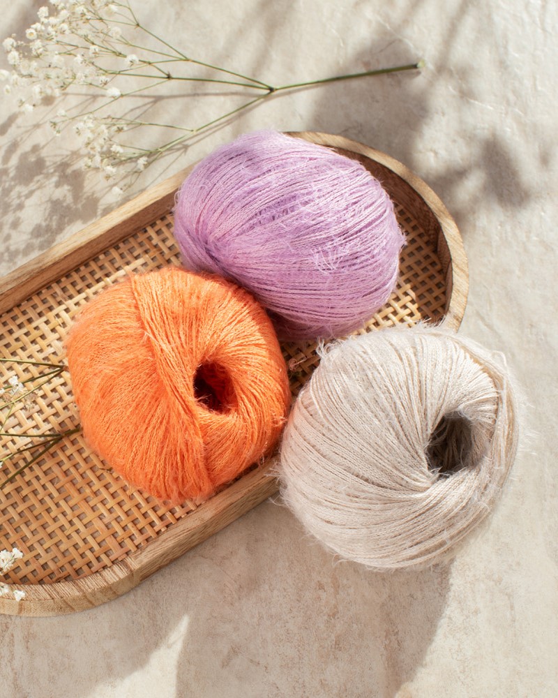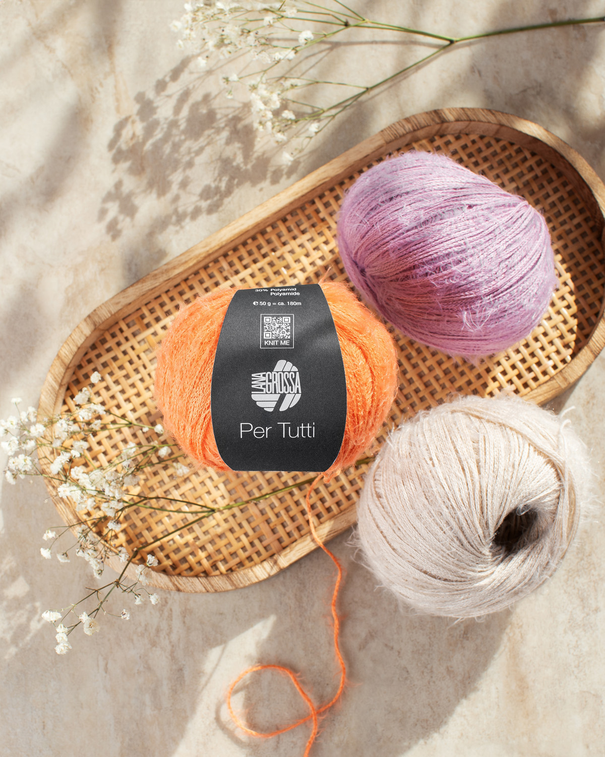 Per Tutti — это лёгкая хлопковая пряжа с интересной структурой и современным характером. Гладкие, слегка блестящие участки чередуются с мягкими, пушистыми зонами, создавая живое полотно и особенно приятную тактильность.
