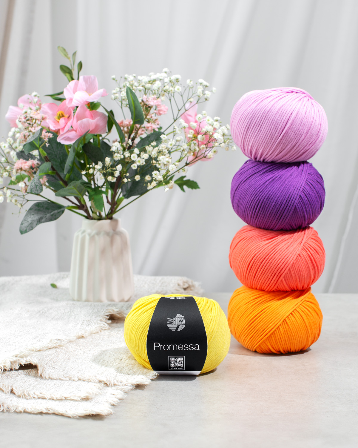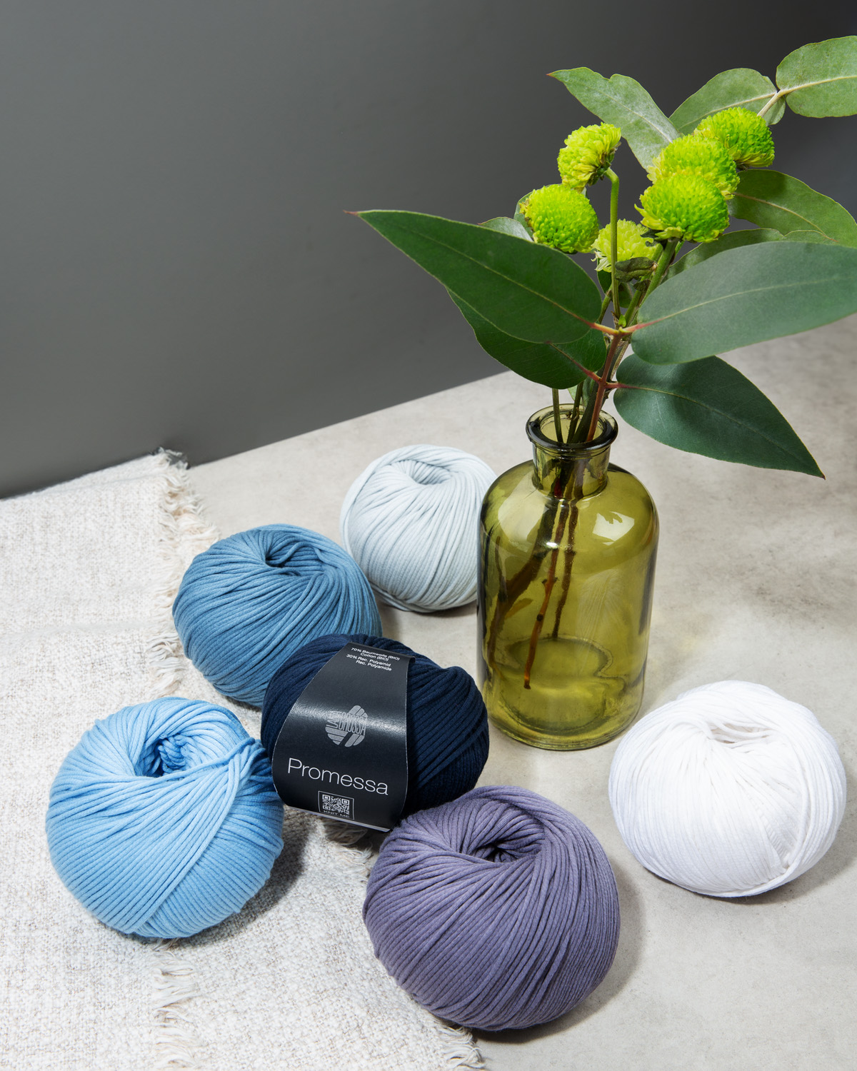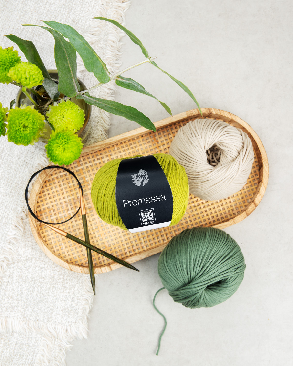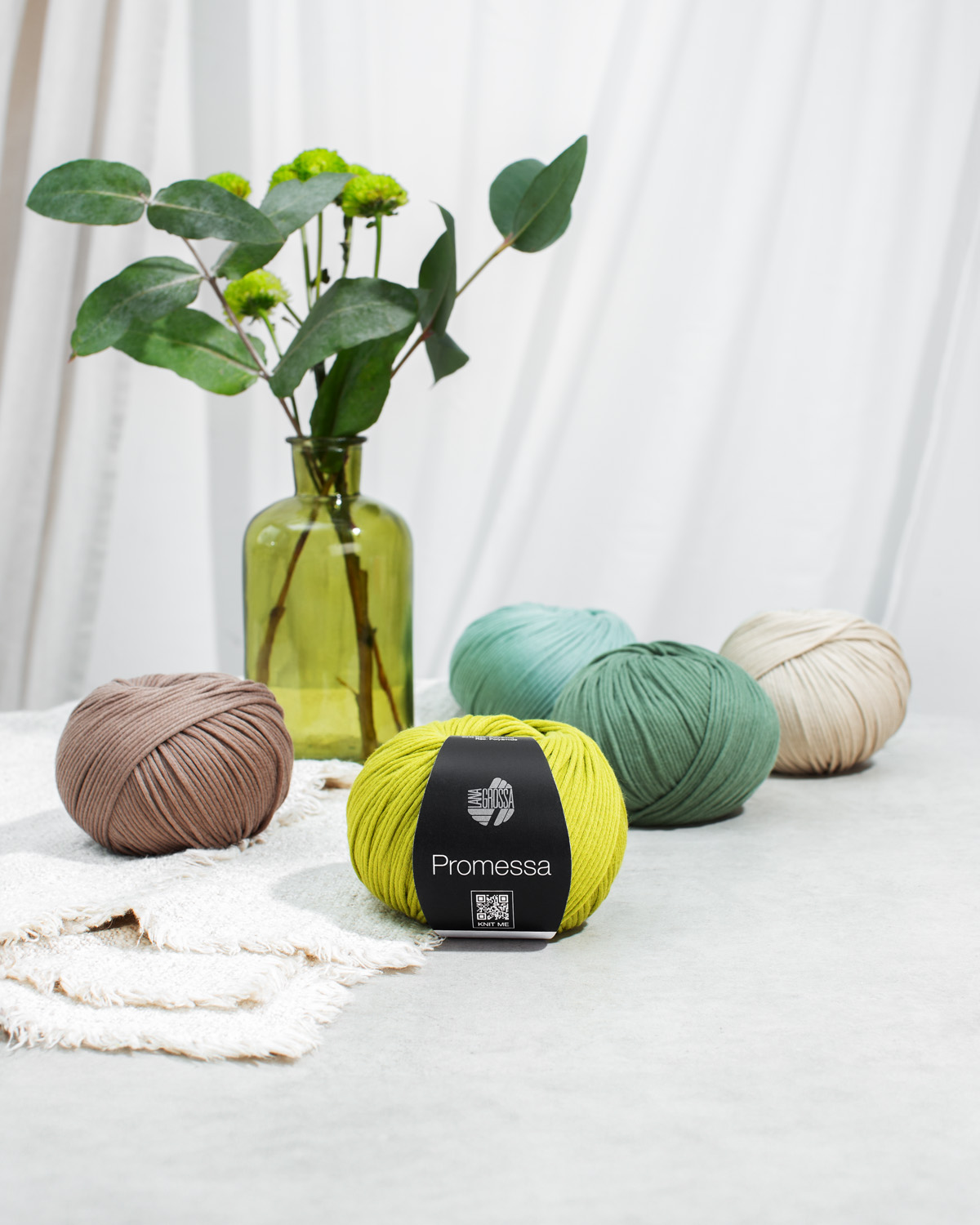 Promessa — это мягкая, объёмная трубчатая пряжа с натуральным обликом и современным стилем. Инновационная смесь органического хлопка и переработанного полиамида обеспечивает лёгкость в носке, приятную тактильность и чёткое, аккуратное полотно.