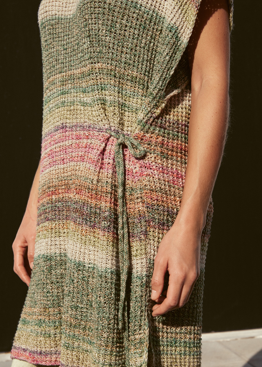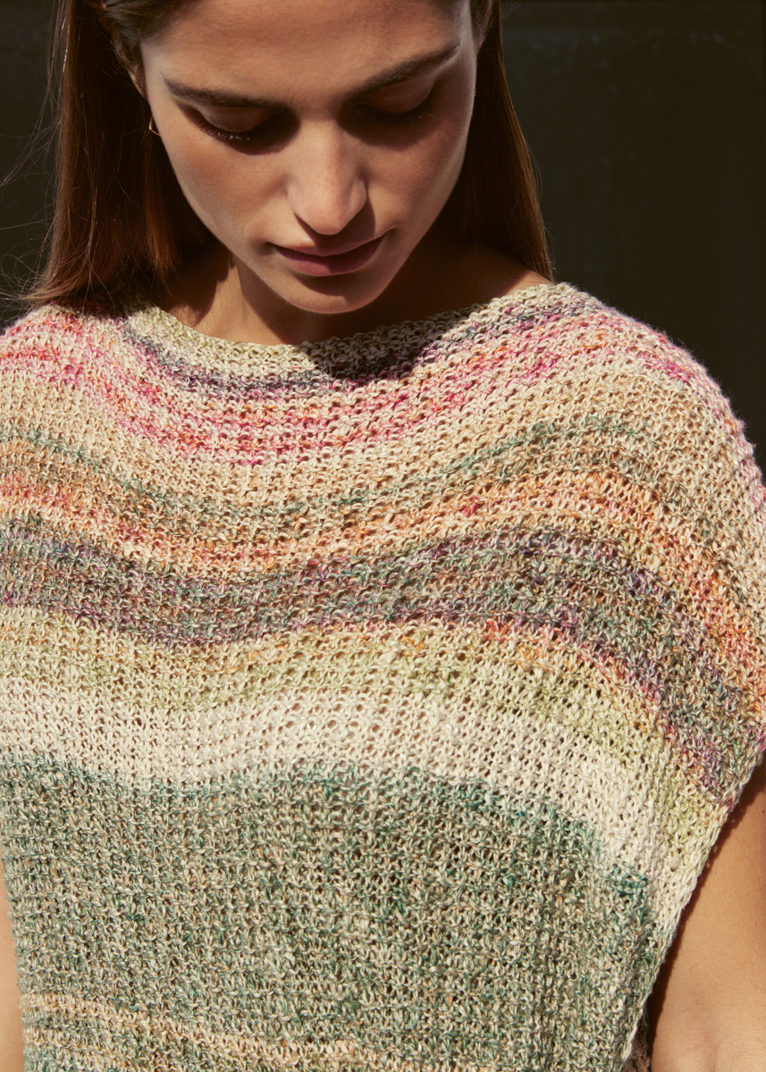500 (500–600) г серо-бежевой/цве- та красной гвоздики/оранжевой/темно-серой/камы- шово-/петрольно-/серо-зеленой/цвета охры (цв. 8) пряжи Mosaico (54% хлопка, 23% льна, 23% вискозы, 270 м/100 г) фирмы Lana Grossa; прямые спицы № 4, 2 чулочные спицы № 4; 1 маленькая пуговица диаме- тром 1,5 см для шнура