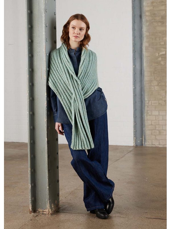 Ecopuno (72% хлопок, 17% шерсть (меринос), 11% альпака (беби), длина нити 215 m/50 g), 250 г серо бежевый (цв. 93), Lana Grossa Brillino (83% вискоза, 17% метал. фибра, длина нити 200 m/25 g), 125 г зеленый пастель/серебряный (цв. 11) и Lana Grossa Natural Superkid Tweed (60% мохер (суперкид), 30% шёлк, 7% хлопок, 3% полиэстер, длина нити 200 m/25 g), 125 г серо зелёный (цв. 617); 1 кр. сп. № 5,5, 80 cm lang, 2 маркировки
