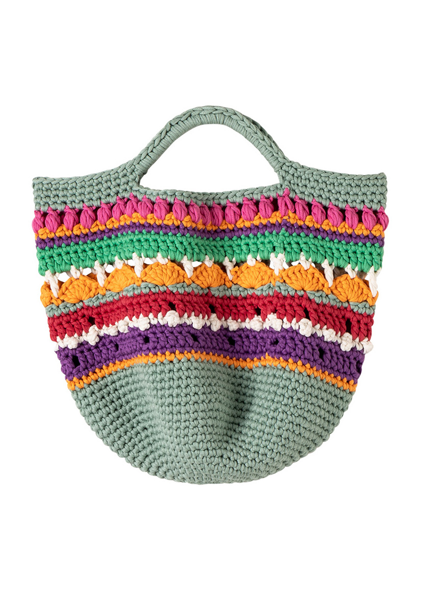 Lana Grossa-Qualität „Promessa” (70 % (био) хлопок, 30 % перераб. полиамид, длина нити = ок. 125 m/50 g): по ок. 100 г пинк (цв. 2) и мята (цв. 16) и по ок. 50 г оранжевый (цв. 4), изумрудный (цв. 9), кремовый (цв. 14), ориент красный (цв. 1) и фиолетовый (цв. 8); 1 крючок № 5.