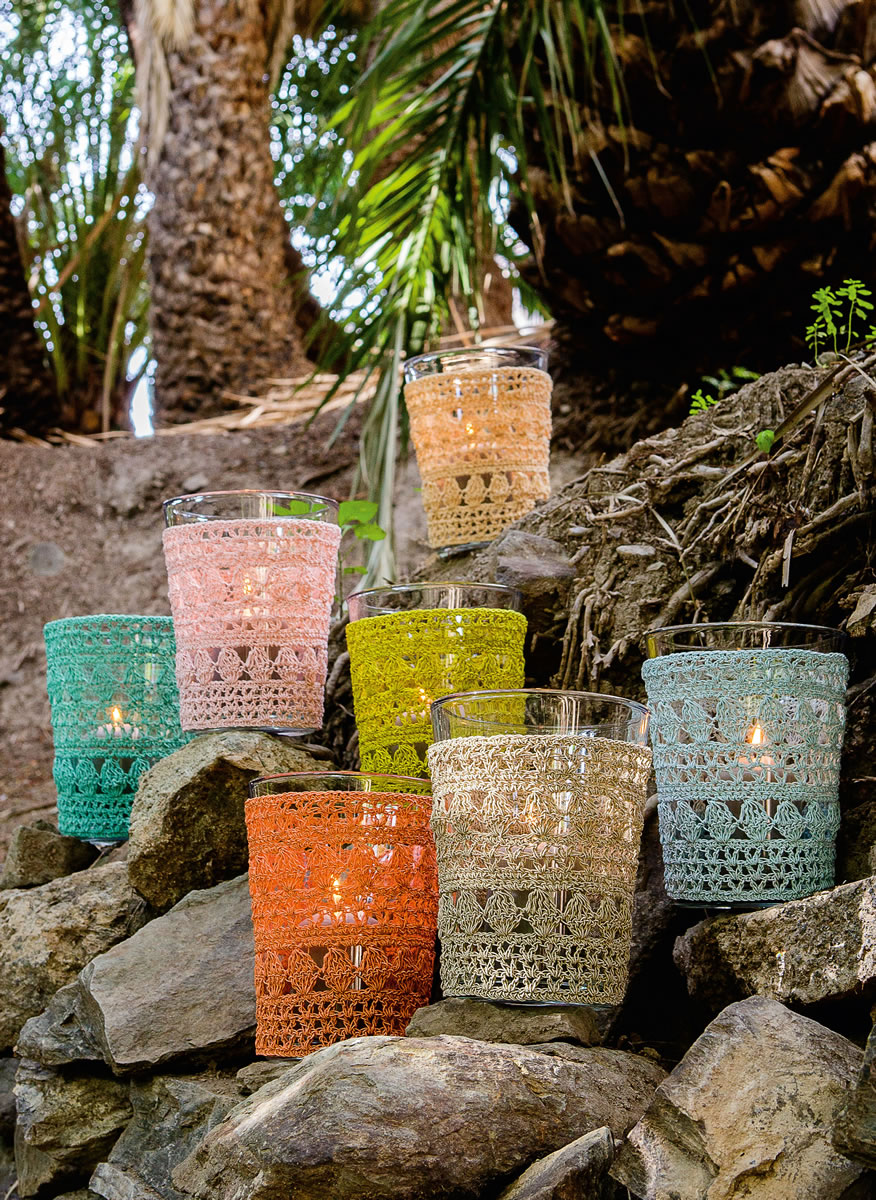 по 50 г персиковой (цвет 69), цвета пудры (цвет 70), абрикосовой (цвет 71), зеленовато-голубой (цвет 72), фисташковой (цвет 73), цвета жадеита (цвет 66) и серо-бежевой (цвет 68) пряжи Secondo фирмы Lana Grossa (55 % хлопка, 25 % полиамида, 20 % шелка, 125 м/50 г); вязальный крючок № 3, 3,5 и 4.