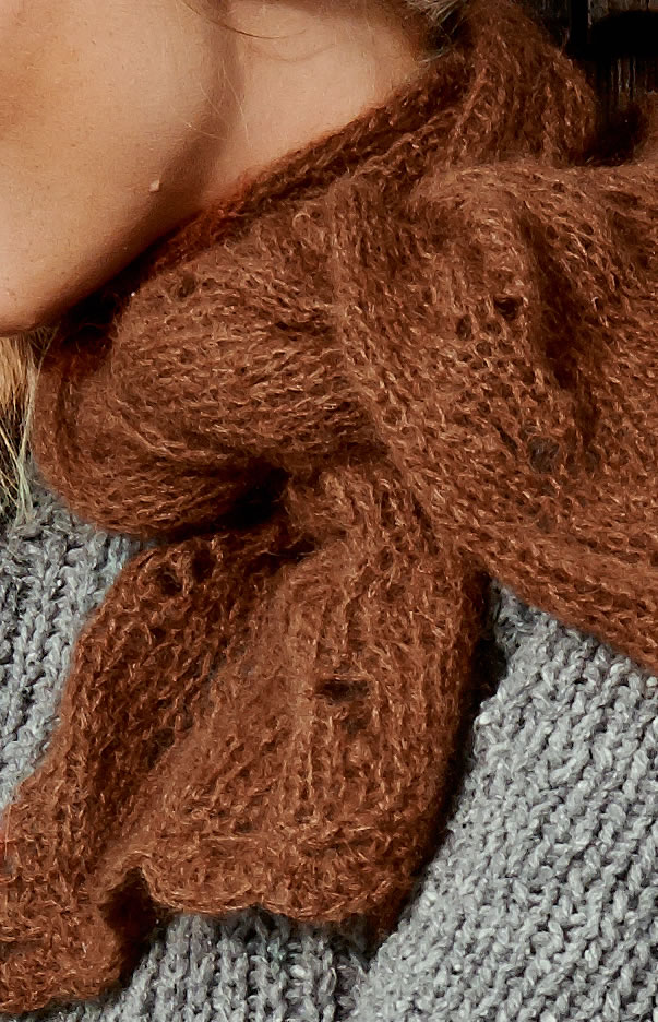 75 г красно-коричневой (цвет 77) пряжи Silkhair фирмы Lana Grossa (70% мохера суперкид, 30% шелка, 210 м/25 г); прямые спицы № 7, крючок № 4.
