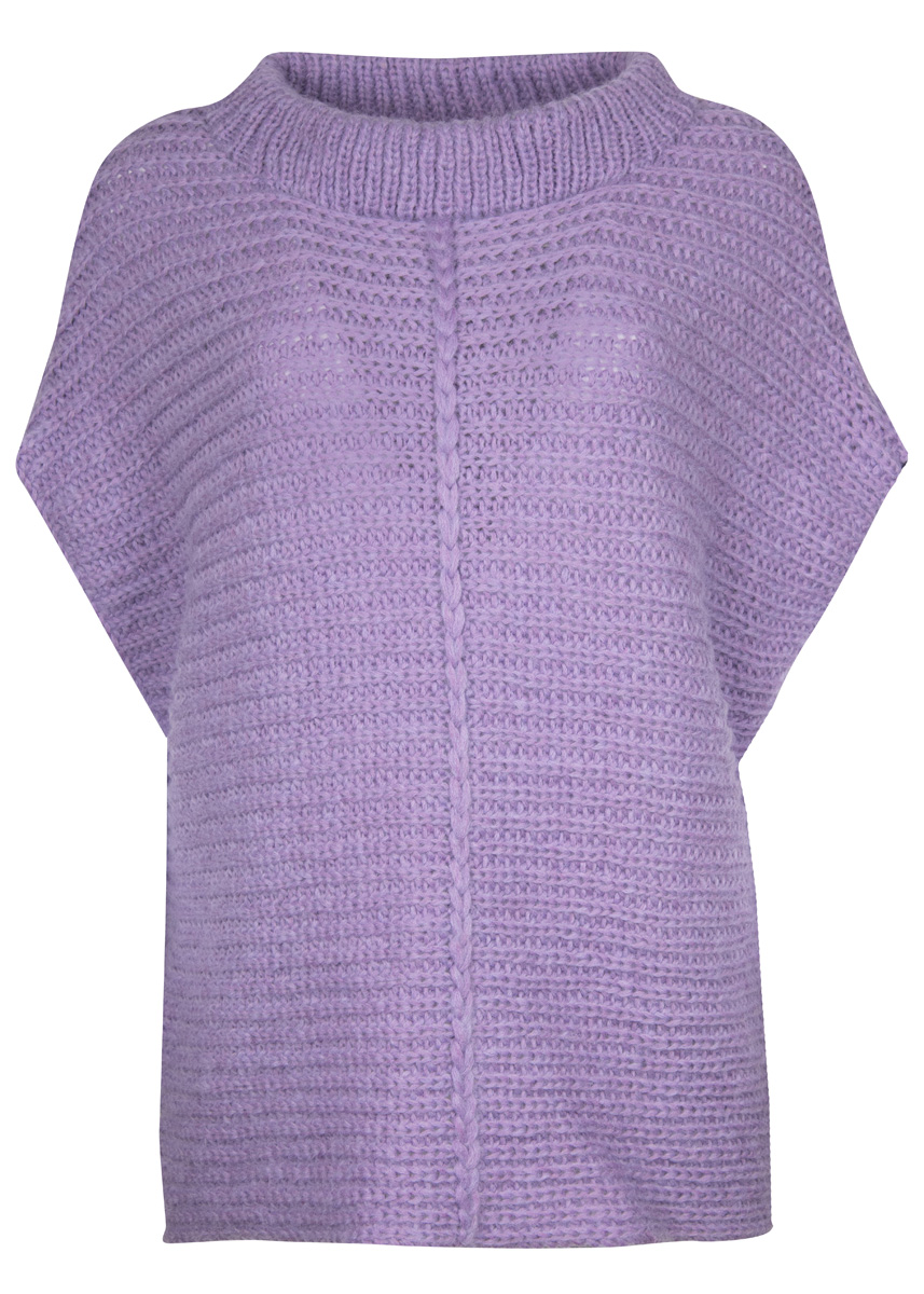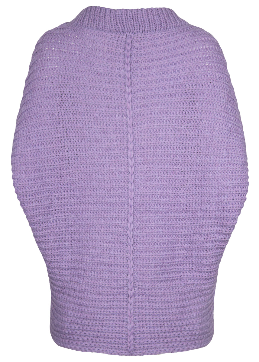 350 (400–450) г ли- ловой (цв. 26) пряжи Brigitte No. 2 (47% шерсти (ягненка) альпака, 45% хлопка, 8% овечьей (мериносовой) шерсти, 140 м/50 г) фирмы Lana Grossa; круговые спицы № 5,5 и № 6 длиной 80 см, круговые спицы № 5 длиной 60 см, 1 большая игла с тупым кон цом