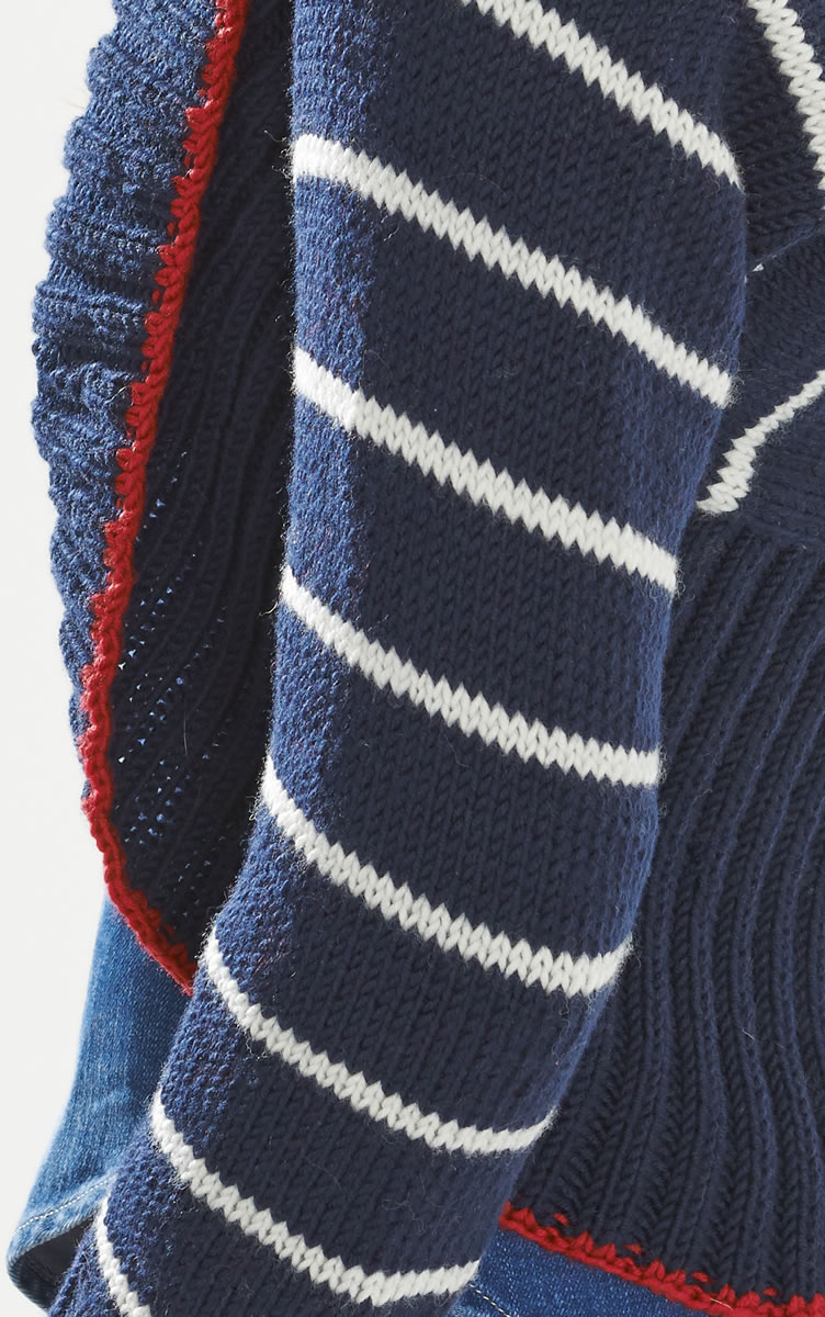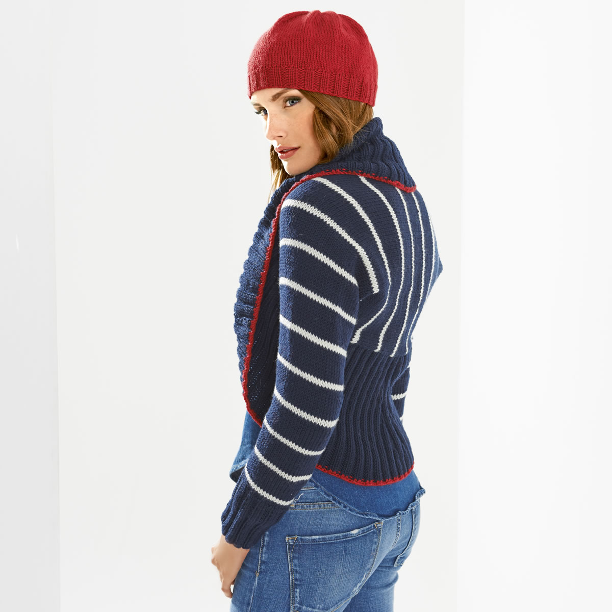 500 г темно-синей (цвет 8), по 50 г белой (цвет 5) и вишневой (цвет 44) пряжи Bingo фирмы Lana Grossa (100% шерсти мерино экстрафайн, подходит для стирки в машине, 80 м/50 г); прямые спицы № 4,5 и 5, круговые спицы № 5 длиной 80 см, круговые спицы № 5,5 длиной 100 см
