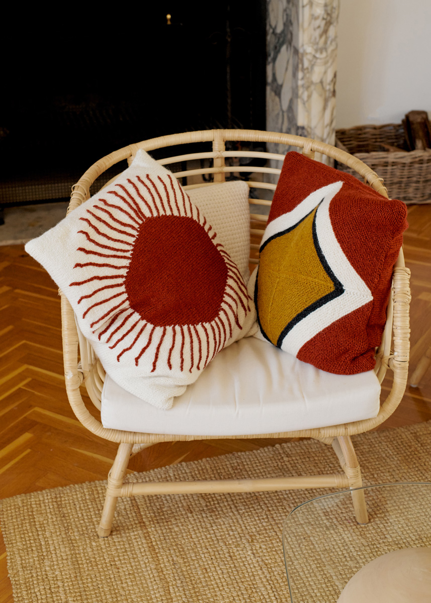 250 г белой суровой (цв. 14) и 100 г кирпично-красной (цв. 91) пряжи Alta Moda Alpaca (90% альпака бэби, 5% шерсти мерино, 5% полиамида, 140 м/50 г) фирмы Lana Grossa; прямые спицы № 4,5, крючок № 4; 1 пригодный к стирке наполнитель раз- мером 50 х 50 см.