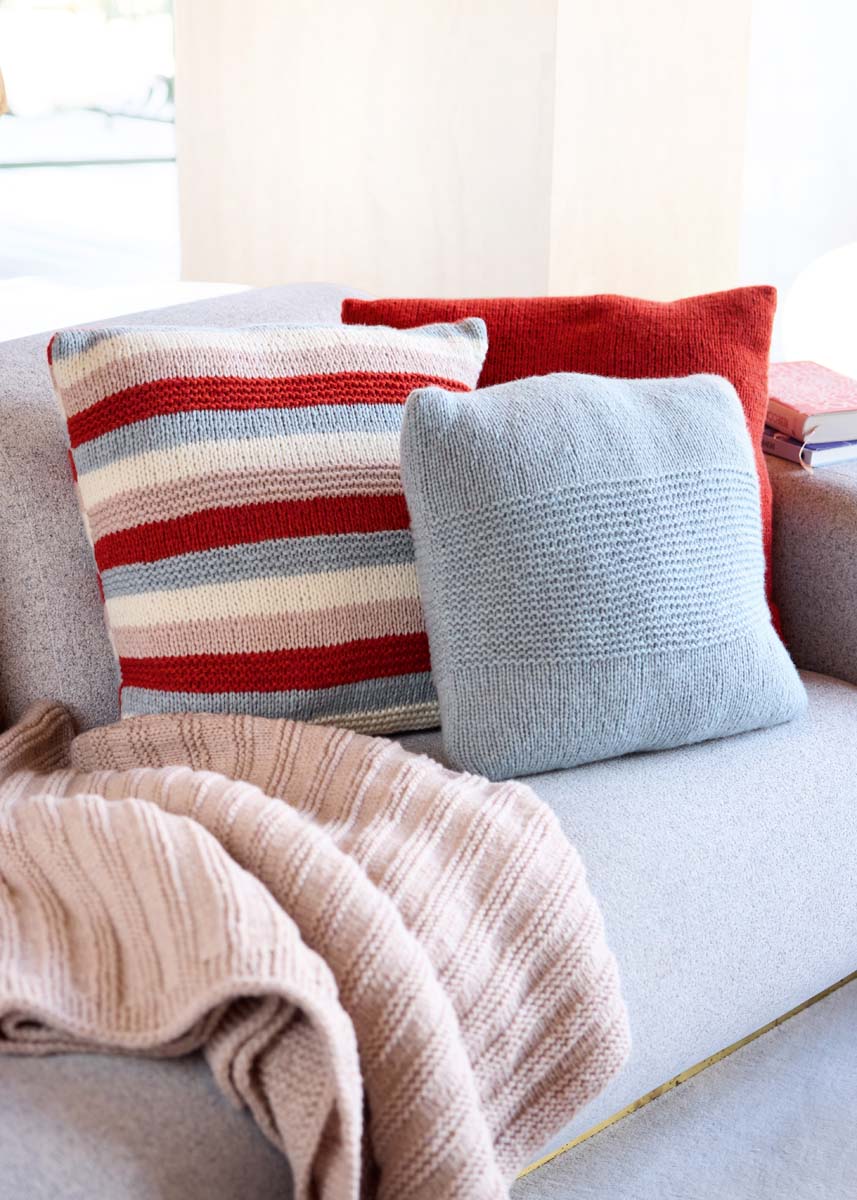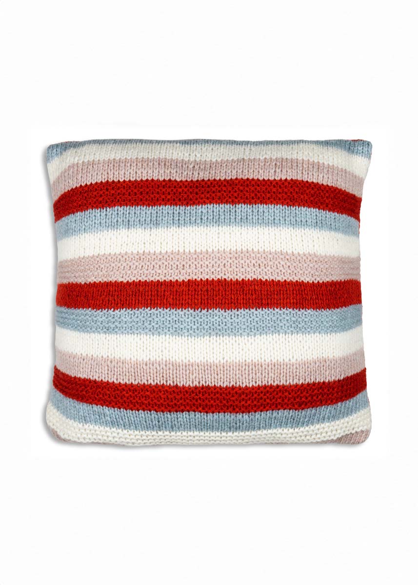 по 100 г красной (цв. 71), бежевой (цв. 76), пастельно-синей (цв. 54) и белой суровой (цв. 16) пряжи Alta Moda Cashmere 16 (78% шерсти мерино 16 микрон, 12% кашемира, 10% полиамида, 110 м/ 50 г) фирмы Lana Grossa; прямые спицы № 7,5; пригодный к стирке наполнитель раз- мером 45 х 45 см.
