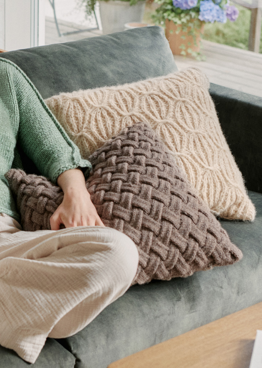 300 г серой/беже- вой меланжевой (цв. 15) пряжи Alta Moda Alpaca (90% шерсти (ягненка) альпака, 5% овечьей (мериносовой) шерсти, 5% полиамида, 140 м/50 г) фирмы Lana Grossa; прямые спицы № 6, 1 вспомогательная спица для кос; 1 пригодный для стирки напол- нитель размером 50 х 50 см