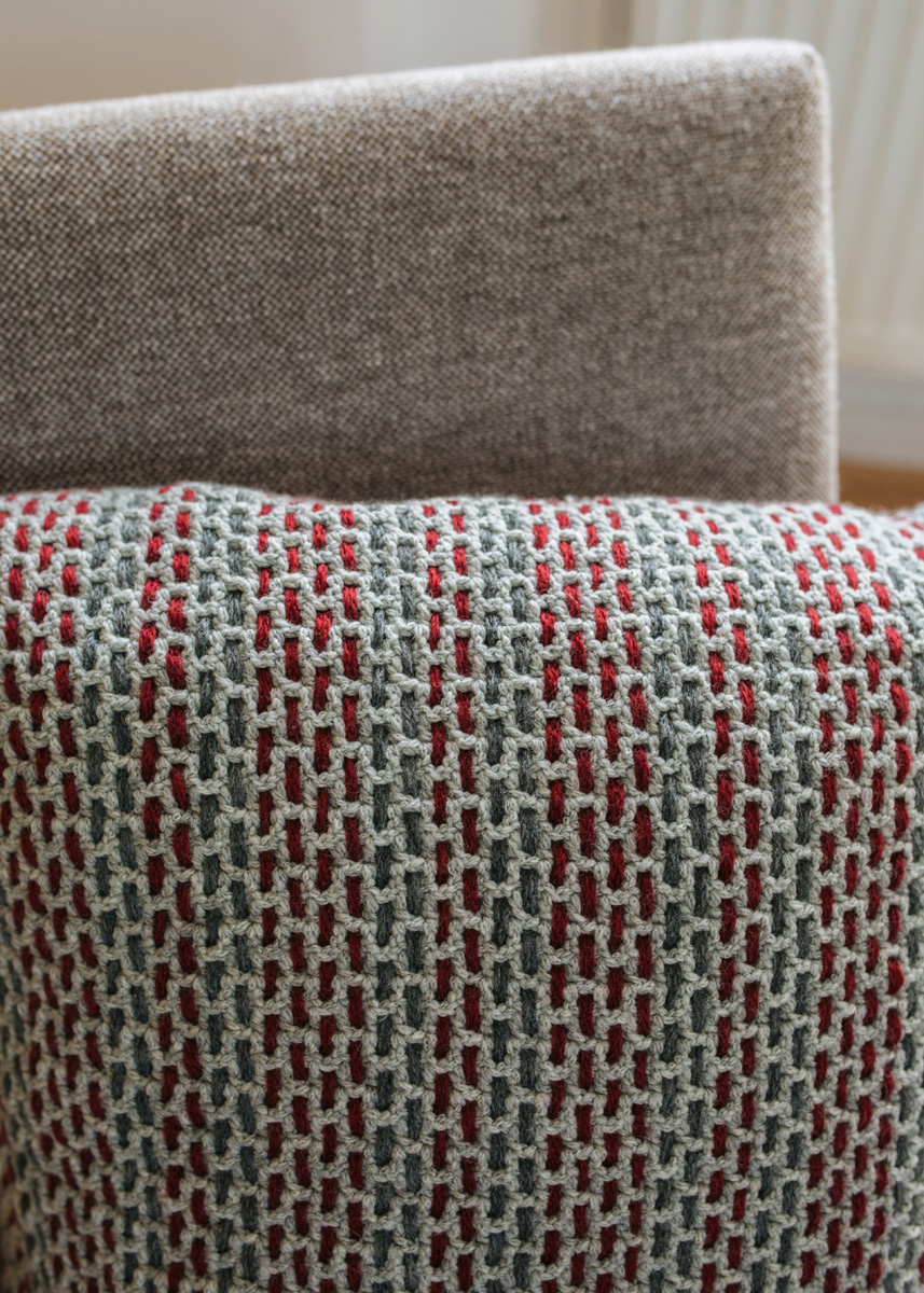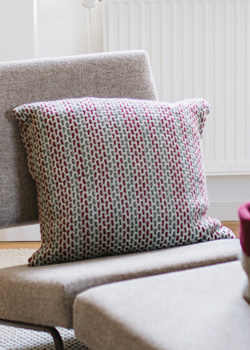 300 г светло-серой (цв. 13), по 50 г темно-красной (цв. 1) и темно-серой (цв. 12) пряжи Cool Merino (90% овечьей (мериносовой) шерсти, 10% полиамида, 150 м/50 г) фирмы Lana Grossa; крючок № 4; пригодный для стирки наполнитель размером 50 х 50 см