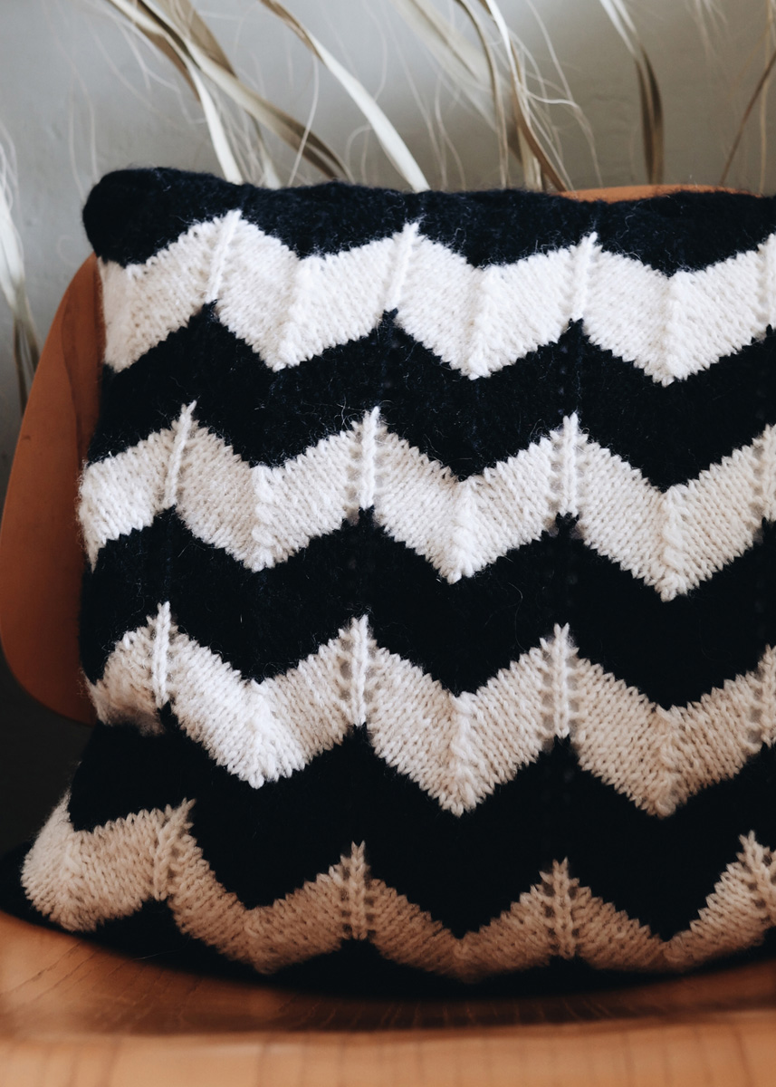 150 г черной (цв. 36) и 100 г белой суровой (цв. 16) пряжи Brigitte N o. 2 (47% альпака бэби, 45% хлопка, 8% шерсти мерино, 140 м/50 г) фирмы Lana Grossa; прямые спицы № 4; пригодный к стирке наполнитель разме- ром 40 х 40 см.