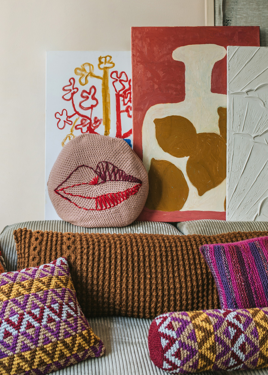 800 г коричневой (цв. 42) пряжи Alta Moda Cashmere 16 (78% овечьей (мериносовой) шер- сти, 12% кашемира, 10% полиамида, 110 м/50 г) фирмы Lana Grossa; пря- мые спицы № 7, 1 вспомогательная спица для кос; пригодный для стирки наполнитель размером 40 х 140 см