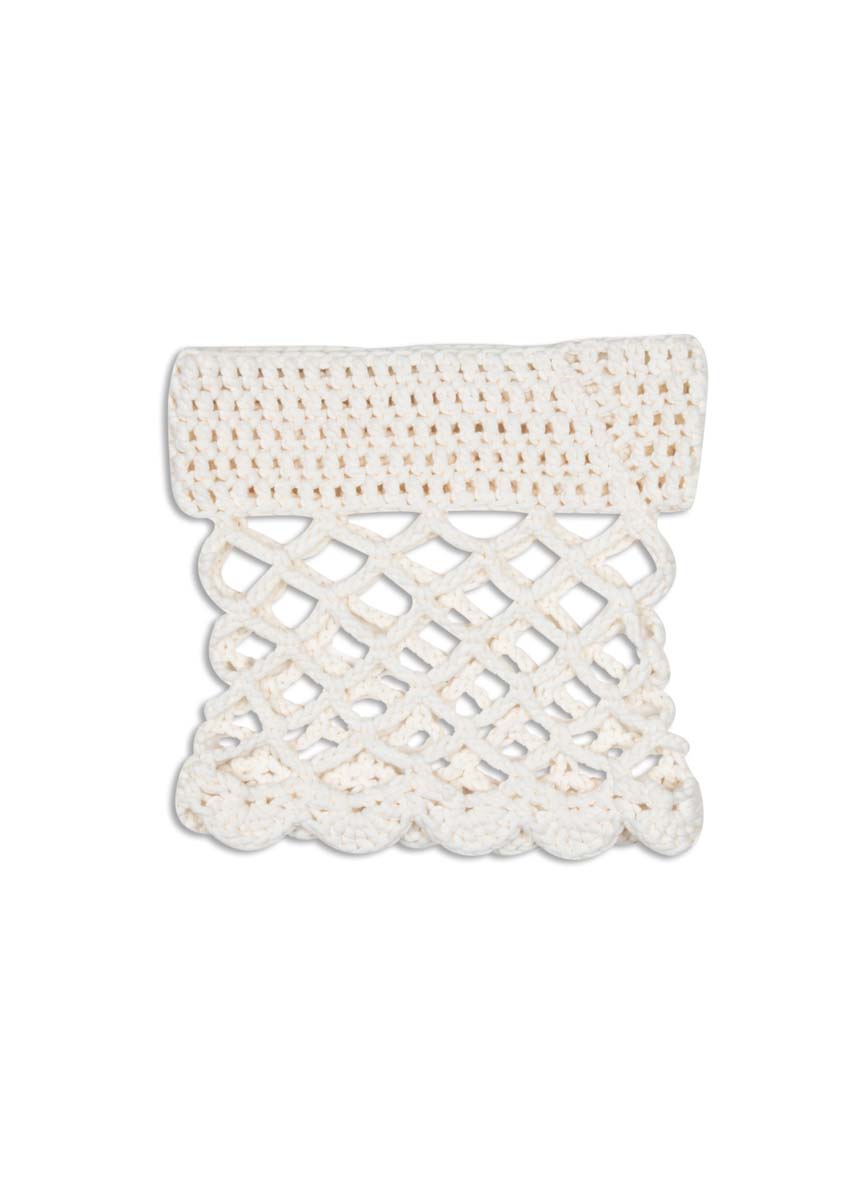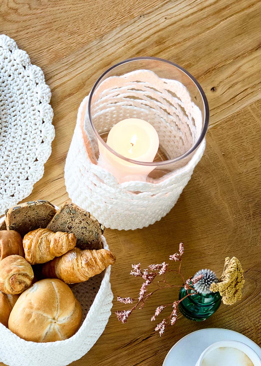 100 г кремовой (цв. 102) пряжи The Tube Fine (68% хлопка, 32% по- лиамида, 140 м/100 г) фирмы Lana Grossa; крючок № 6; стеклянный цилиндр диаметром 15 см, длиной окружности 48 см и высотой 20 см