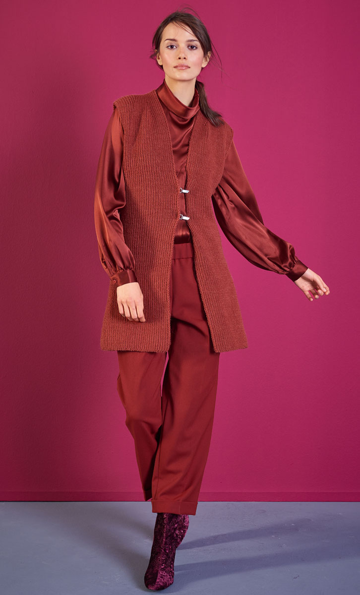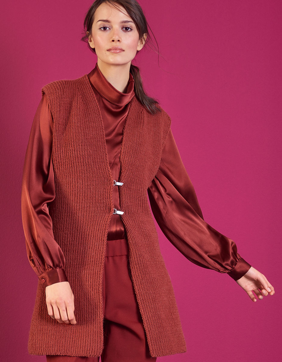 400 (450 – 500 – 550) г кирпично-красной (цвет 33) пряжи Cool Wool Alpaca фирмы Lana Grossa (70 % шерсти мерино экстрафайн, 30 % бэби альпака, 140 м/50 г); прямые спицы № 4,5, 2 металлических зажима матовых металлических серебристых.