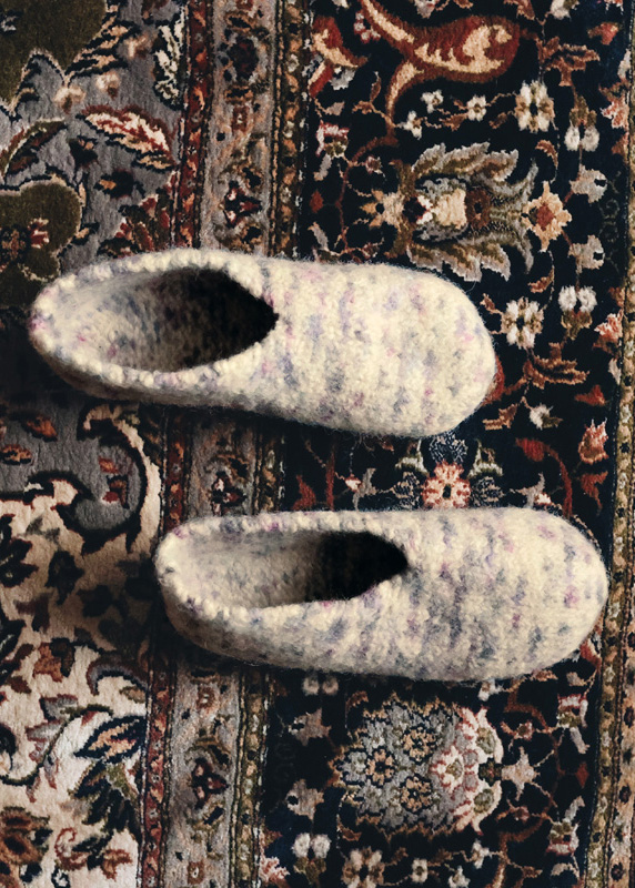 150 (150–200) г белой суровой/сиреневой/фиолетовой/ сливовой (цв. 833) пряжи Feltro Chess (100% шерсти, 50 м/50 г) фирмы Lana Grossa; прямые спицы № 8, чулочные спицы № 8.