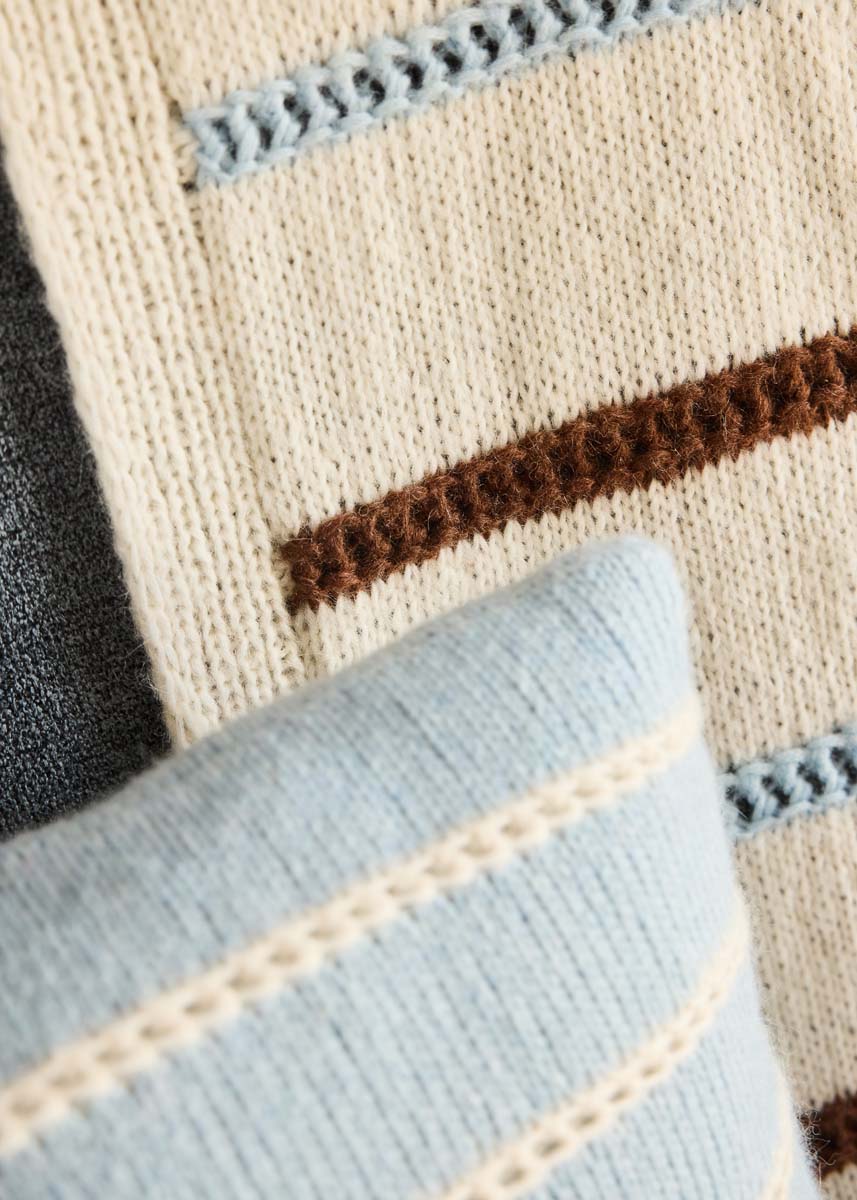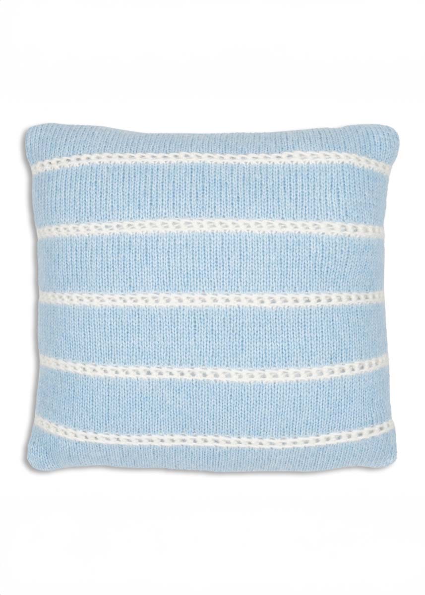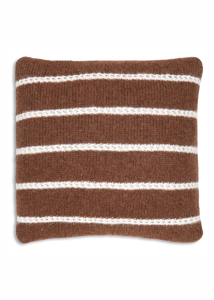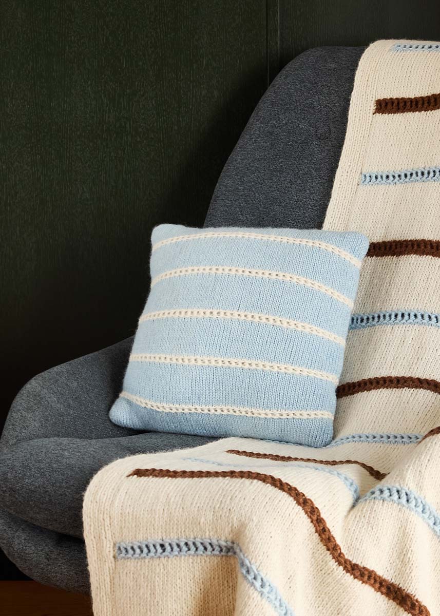 по 200 г шоколадно-ко- ричневой (цв. 68) или светло-синей (цв. 65) и по 50 г белой суровой (цв. 16) пряжи Brigitte No. 2 (47% альпака бэби, 45% хлопка, 8% шерсти мерино, 140 м/50 г) фирмы Lana Grossa; прямые спицы № 4; 2 пригодных для стирки наполнителя размером 40 х 40 см.