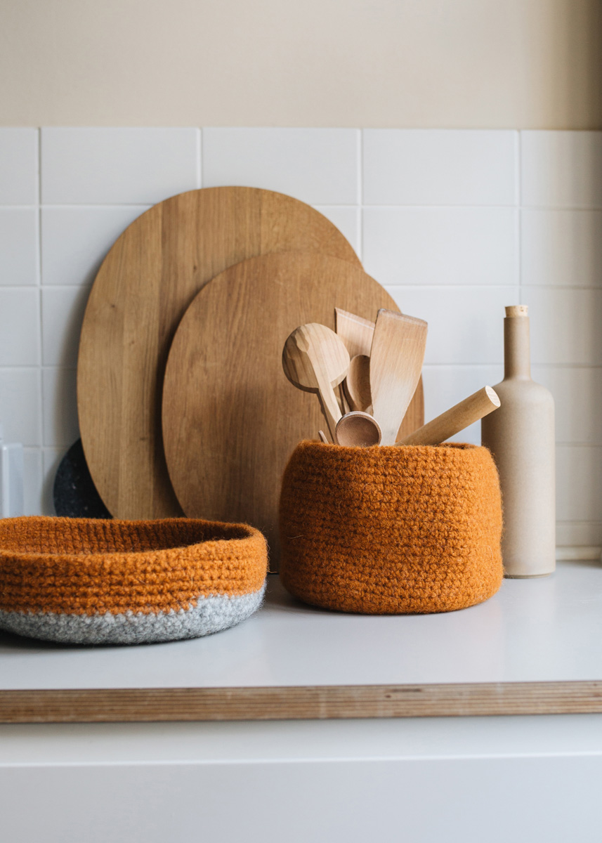 150 г серой ме- ланжевой (цв. 3) и 100 г янтарной (цв. 92) пряжи Feltro (100% шерсти, 50 м/50 г) фирмы Lana Grossa; крючок № 8; 1 маркер для петель