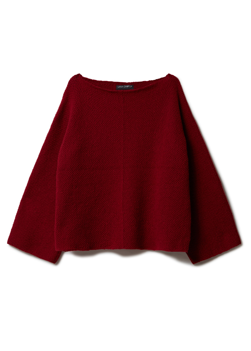 350 (400–450–500) г цвета крас- ного вина (цв. 57) пряжи Cashmere 16 Fine (80% шер- сти мерино, 10% кашемира, 10% полиамида, 320 м/ 50 г) фирмы Lana Grossa; круговые спицы № 5 длиной 100 см, 2 лески от круговых спиц длиной 60 см и 1 вспомогательная спица для кос.