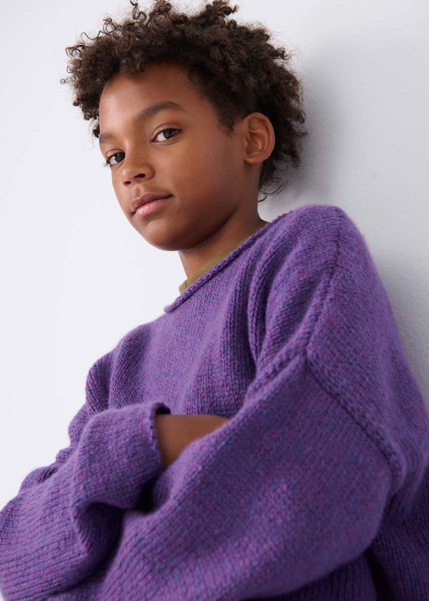 300 (300–350–350) г цвета баклажана (цв. 25) пряжи Cool Merino (90% шерсти мерино, 10% по- лиамида, 150 м/50 г) фирмы Lana Grossa; прямые спицы № 5 и № 5,5, короткие круговые спицы № 5.