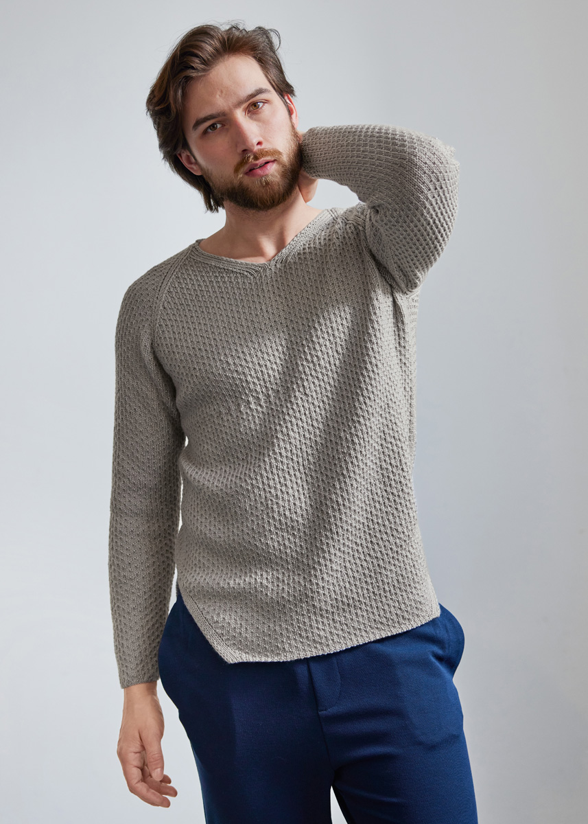 500 (550–600) г каменисто-серой (цв. 29) пряжи Cool Wool Cashmere (90% овечьей (ме- риносовой) шерсти, 10% кашемира, 160 м/50 г) фирмы Lana Grossa; прямые спицы № 4