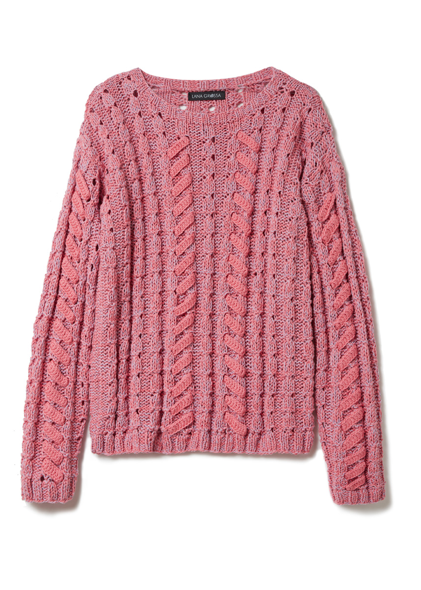 450 г коралловой (цв. 25) пряжи Dodici (65% хлопка, 25% ви- скозы, 10% льна, 110 м/50 г) и 200 г си- ренево-лиловой (цв. 6) пряжи Setapura (100% шелка, 200 м/50 г) фирмы Lana Grossa; прямые спицы № 5 и № 5,5, кру- говые спицы № 5 длиной 40 см, крючок № 4.