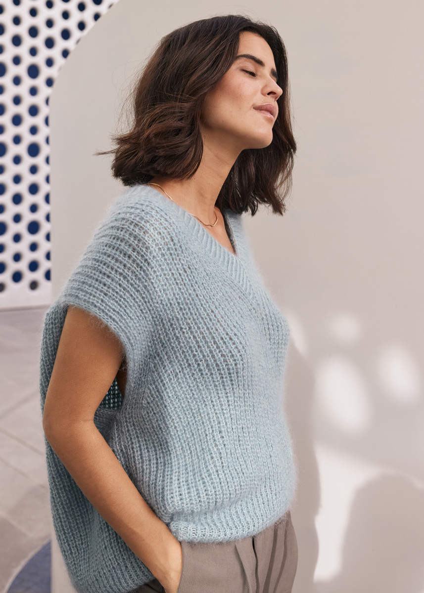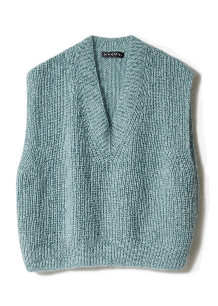 250 (300–350) г мят- но-бирюзовой (цв. 44) пряжи Ecopuno (72% хлопка, 17% шерсти мерино, 11% альпака бэби, 215 м/50 г) и 125 (150–175) г цвета мяты (цв. 175) пряжи Silkhair (70% мохера суперкид, 30% шелка, 210 м/25 г) фирмы Lana Grossa; прямые спицы № 3,5 и № 4, круговые спицы № 3,5 длиной 40 см.