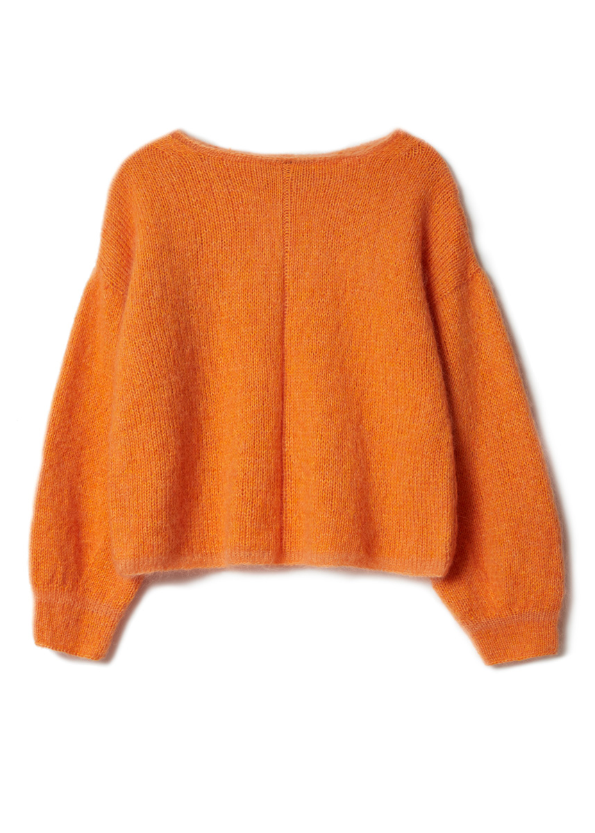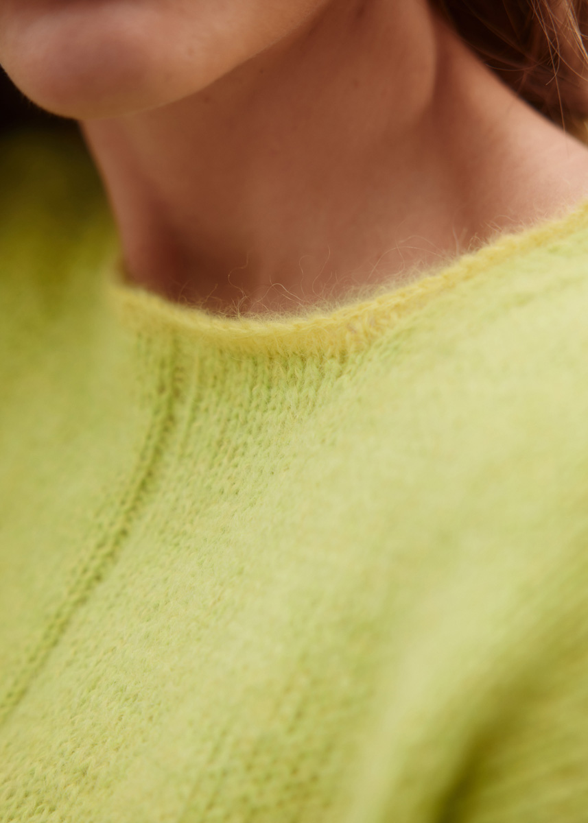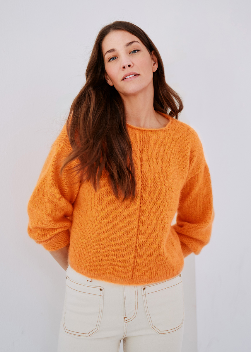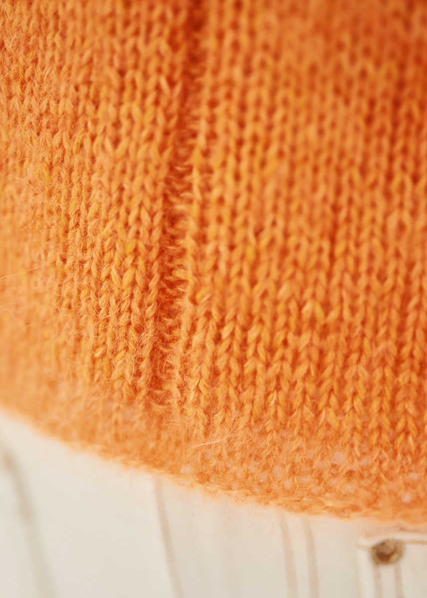250 (250–300–300) г мандариновой (цв. 72) или неоново-зеленой (цв. 96) пряжи Ecopuno (72% хлопка, 17% шерсти мерино, 11% альпака бэби, 215 м/50 г) фирмы Lana Grossa и 125 (125–150– 150) г цвета тыквы (цв. 190) или зелено-желтой (цв. 185) пряжи Silkhair (70% мохера суперкид, 30% шелка, 210 м/25 г) фирмы Lana Grossa; прямые спицы № 3,5 и № 4, короткие круговые спицы № 3,5