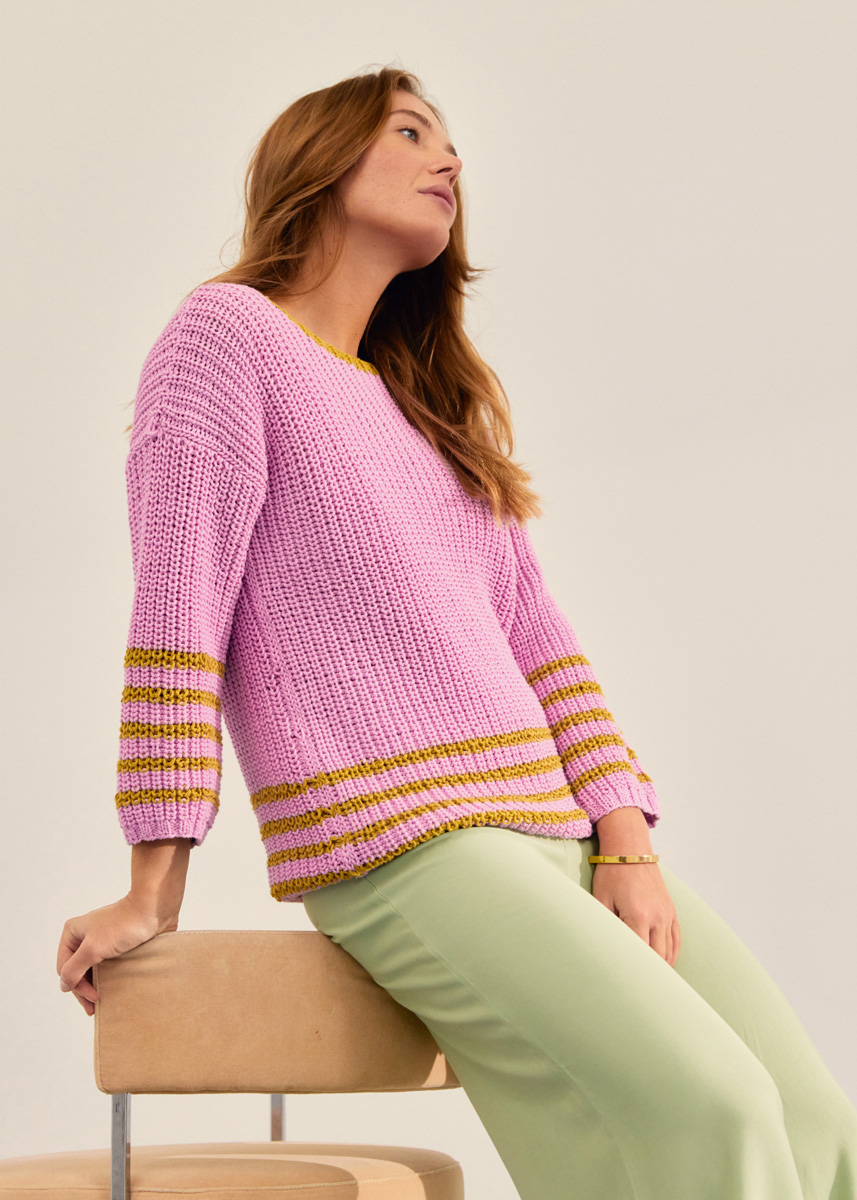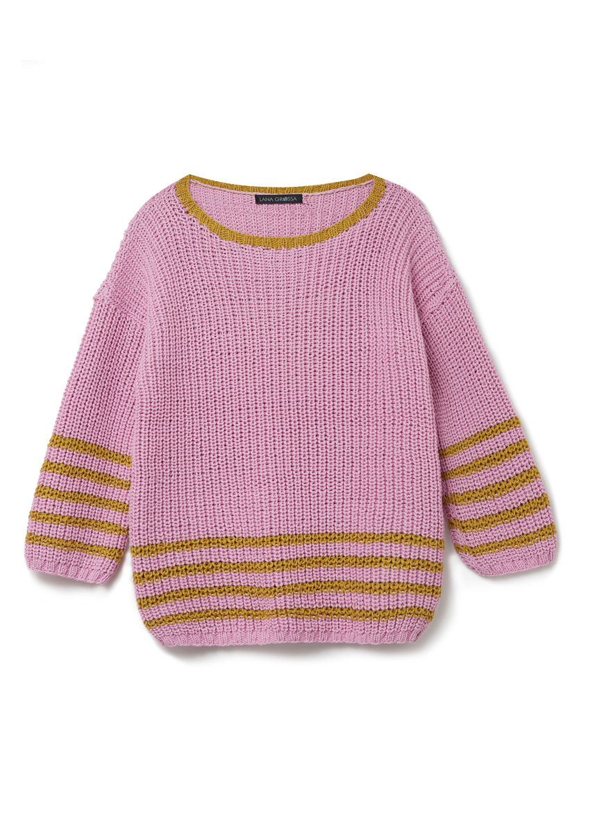600 (650–700) г сиренево-розовой (цв. 6) пряжи Promessa (70% органического хлопка, 30% полиамида восстановленного, 125 м/50 г) и 100 (150–150) г цвета карри (цв. 28) пряжи Dodici (65% хлопка, 25% вискозы, 10% льна, 110 м/50 г) фирмы Lana Grossa; прямые спицы № 4,5 и № 5, круговые спицы № 4,5 длиной 40 см.