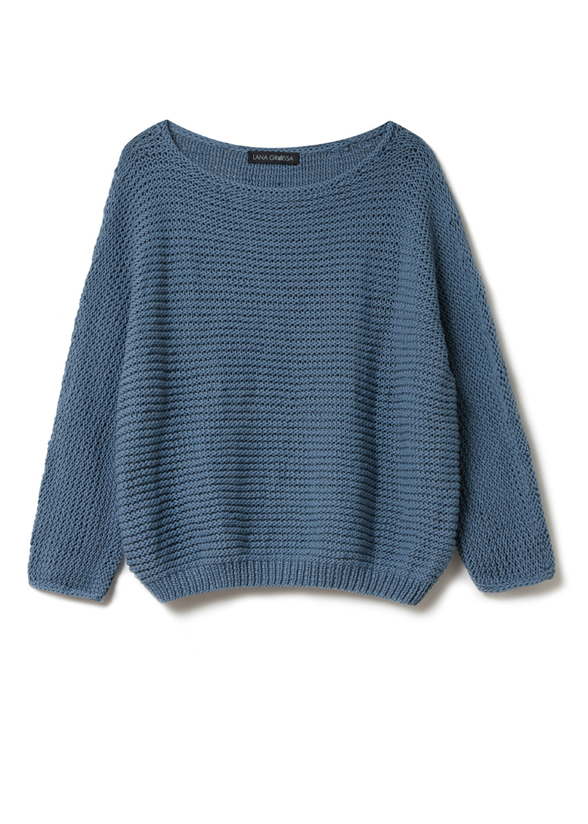 350 (400–450–500) г серо-синей (цв. 20) пряжи Promessa (70% органического хлопка, 30% поли- амида восстановленного, 125 м/50 г) фирмы Lana Grossa; прямые спицы № 5 и № 10.