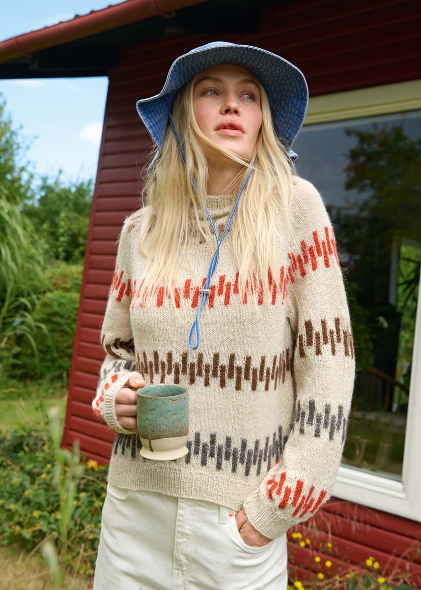 300 (350/400/450) г бело-бежевой (цв. 109) и по 50 г ржаво-оранжевой (цв. 104), цвета верблюжьей шерсти (цв. 111), шоколадно-коричневой (цв. 113) и серо-коричневой (цв. 114) пряжи Natural Lama Fine (100% шерсти лама бэби, 150 м/50 г) фирмы Lana Grossa; круговые спицы № 3,5 и № 4 длиной 100 см (круговые ряды с небольшим числом петель вязать методом мэджик луп); 5 маркеров для петель (МП), один из которых должен отличаться по цвету от остальных 4 маркеров для отметки начала круг. ряда.