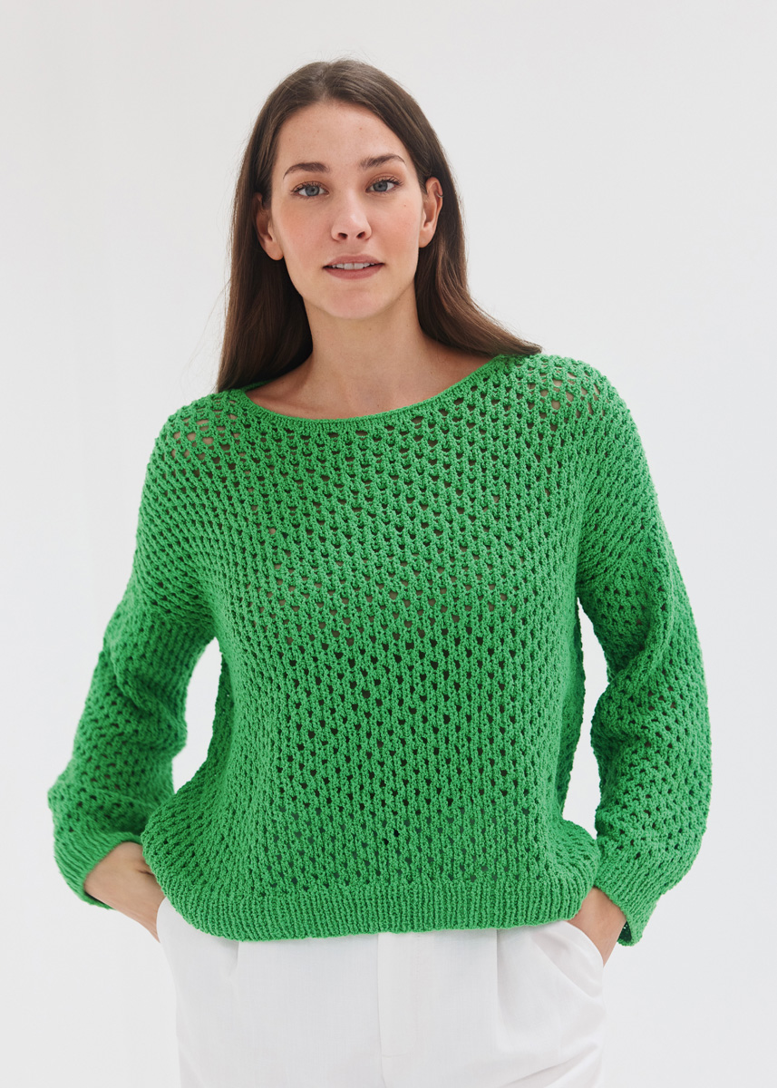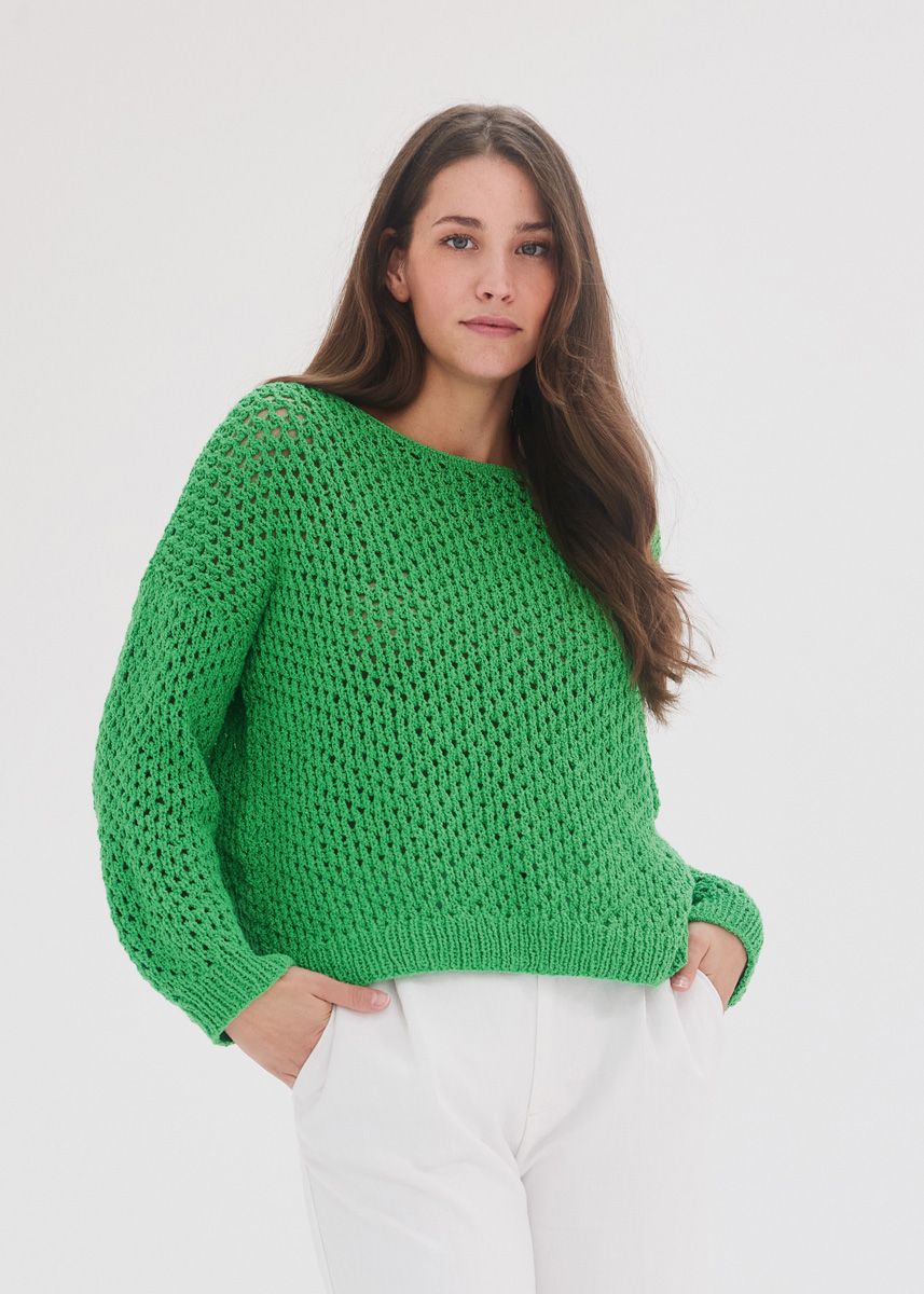 400 (400-450–500–550) г цвета майской зелени (цв. 16) пряжи Riccio (84% хлопка, 16% полиамида, 110 м/50 г) фирмы Lana Grossa; прямые спицы № 5 и № 5,5, короткие круговые спицы № 5