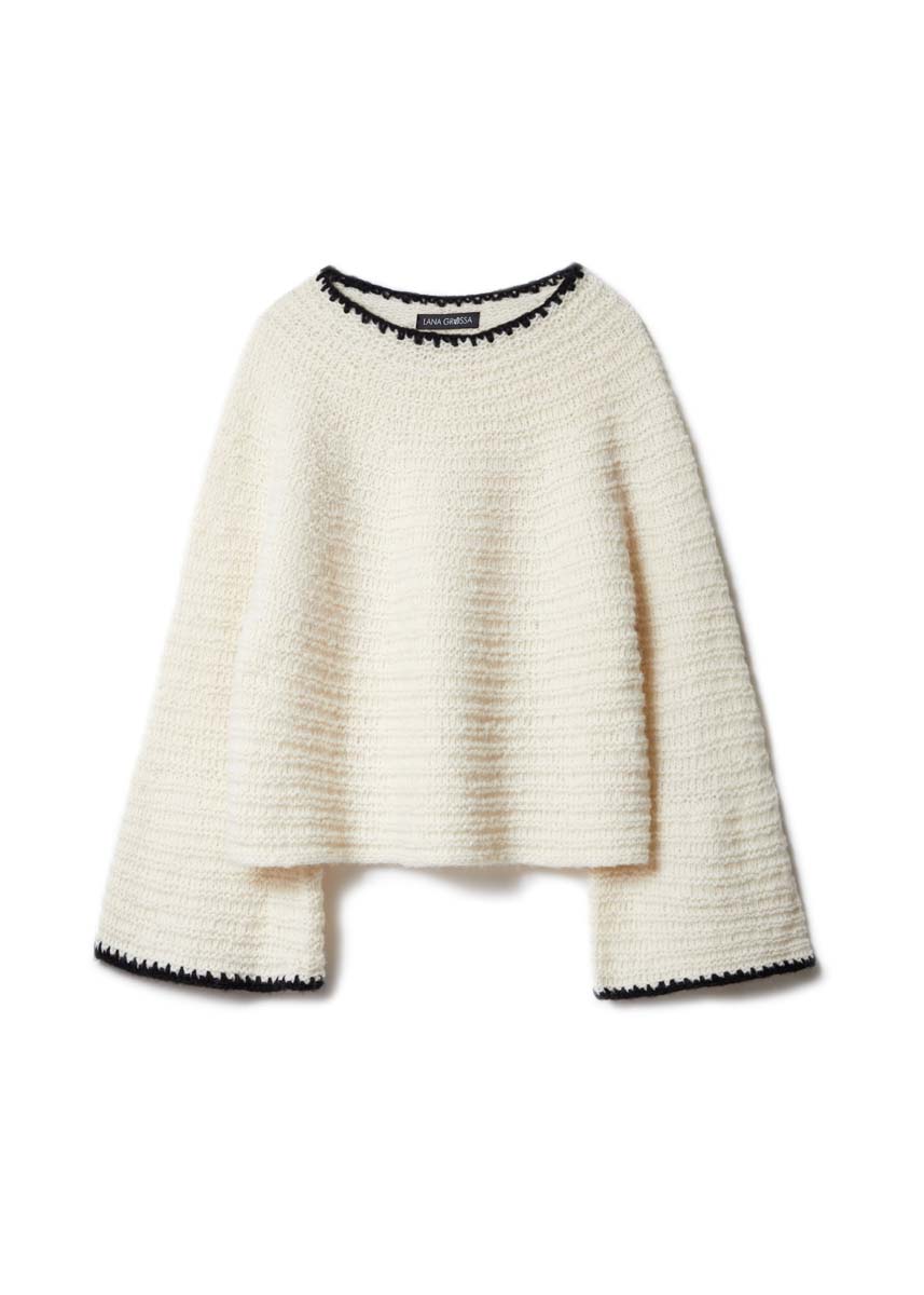 300 (350) г белой су- ровой (цв. 13) пряжи Airy (42% альпака бэби, 40% хлопка, 18% шерсти мерино эк- страфайн, 170 м/50 г) и 50 г черной (цв. 12) пряжи Alpaca Air (62% альпака бэби, 27% полиамида, 11% шерсти мерино экс- трафайн, 140 м/50 г) фирмы Lana Grossa; круговые спицы № 4 длиной 50, 80 и 120 см, чулочные спицы № 4, крючок № 6.