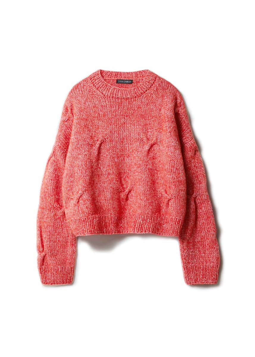 450 (500–550) г розо- вой/цвета омара (цв. 10) пряжи Twinny (97% шерсти мерино экстрафайн, 3% полиамида, 100 м/50 г) фирмы Lana Grossa; прямые спицы № 6 и № 7, кр говые спицы № 6 длиной 50 см.
