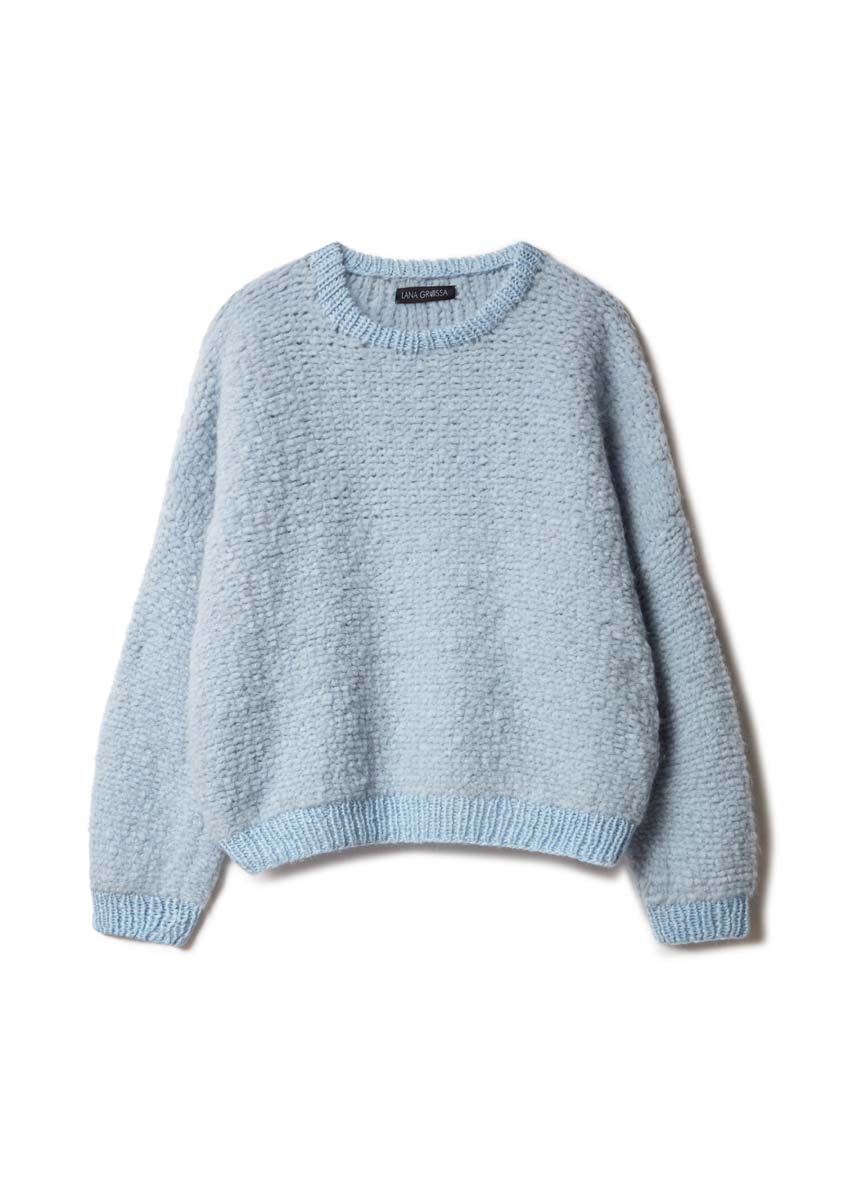 300 (350–400) г зеленовато-голубой (цв. 9) пряжи Royal Alpaca (93% альпака royal, 7% полиамида, 95 м/ 50 г) и 50 (100–100) г светло-синей (цв. 65) пряжи Brigitte No. 2 (47% альпака бэби, 45% хлопка, 8% шерсти мерино, 140 м/ 50 г) фирмы Lana Grossa; прямые спицы № 6 и № 8, круговые спицы № 6 длиной 50 см