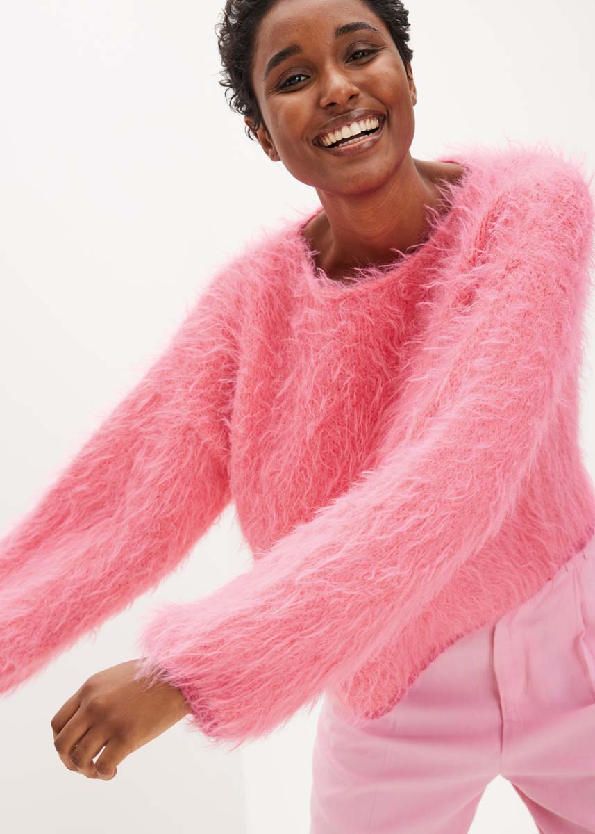 450 (500–550) г конфетно-розовой (цв. 8) пряжи Basta (50% шерсти мерино, 50% полиамида, 100 м/50 г) и 50 г ярко-розовой (цв. 19) пряжи Brigitte No. 2 (47% альпака бэби, 45% хлопка, 8% шерсти мерино, 140 м/50 г) фирмы Lana Grossa; прямые спицы № 6.