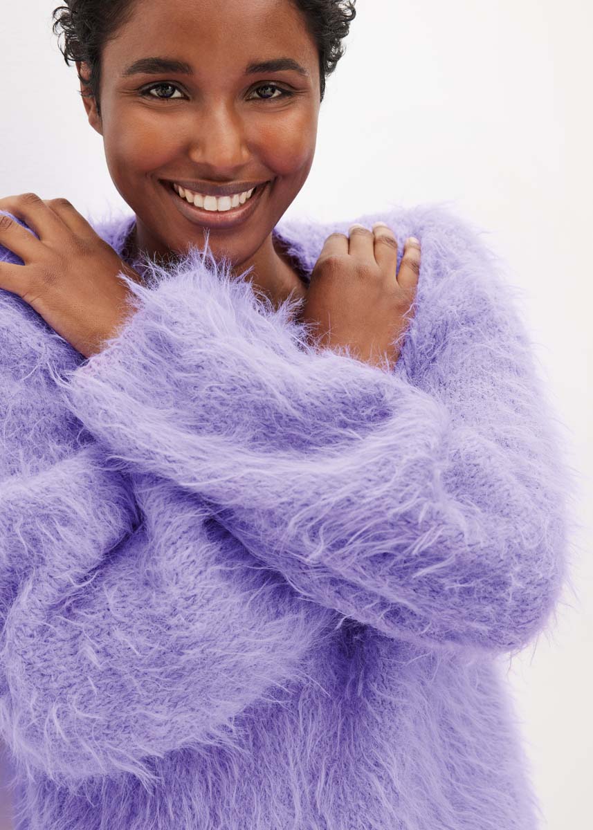 450 (500–550) г лиловой (цв. 19) пряжи Basta (50% шерсти мерино, 50% полиамида, 100 м/50 г) и 50 г сиреневой (цв. 232) пряжи Cool Merino Big (90% шерсти мерино, 10% полиамида, 90 м/50 г) фирмы Lana Grossa; прямые спицы № 6.