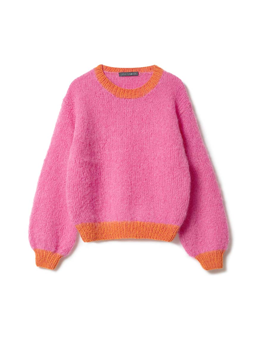 50 (50–100) г оранже- вой (цв. 21) пряжи Cool Merino (90% шерсти мерино, 10% полиамида, 150 м/50 г) и 250 (300–350) г ярко-розовой (цв. 8) пряжи Mohair Moda (70% мохера кид, 20% шерсти мерино суперфайн, 10% полиамида, 140 м/50 г) фирмы Lana Grossa; прямые спицы № 4,5 и № 5, круго- вые спицы № 4,5 длиной 50 см.