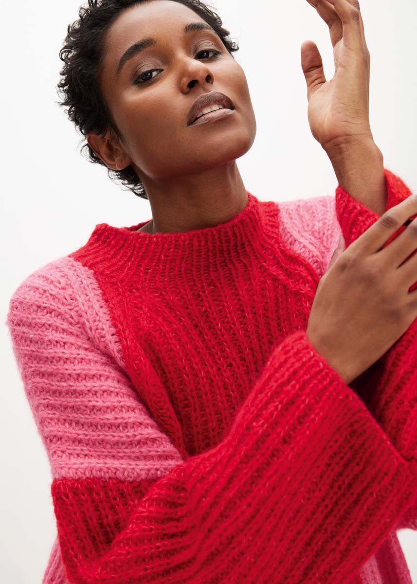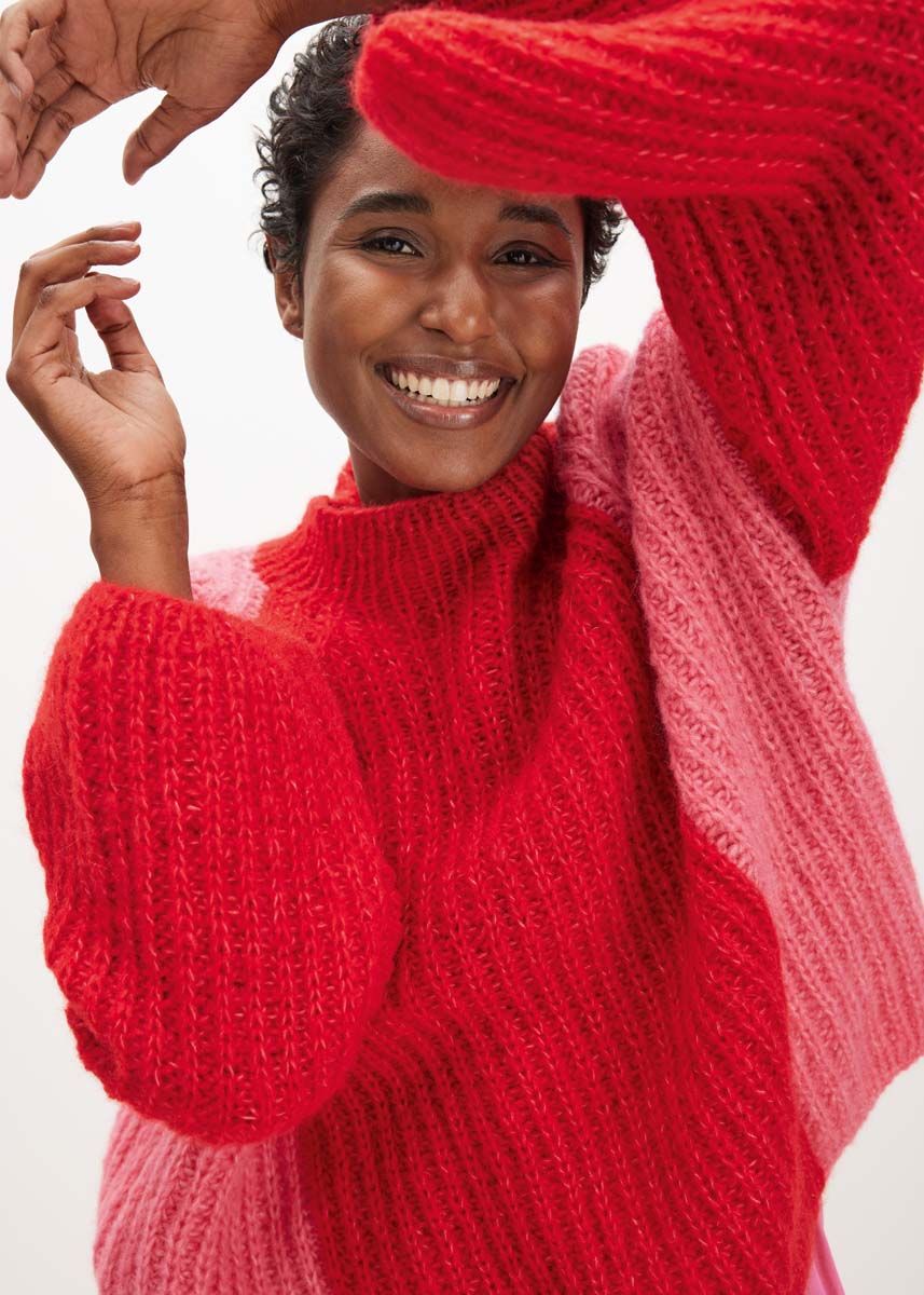 250 (300–350) г крас- ной (цв. 9) и 150 (150–200) г ярко-розо- вой (цв. 7) пряжи Alpaca Air (62% альпака бэби, 27% полиамида, 11% шерсти мери- но экстрафайн, 140 м/50 г) фирмы Lana Grossa; прямые спицы № 5, круговые спи- цы № 5 длиной 50 см