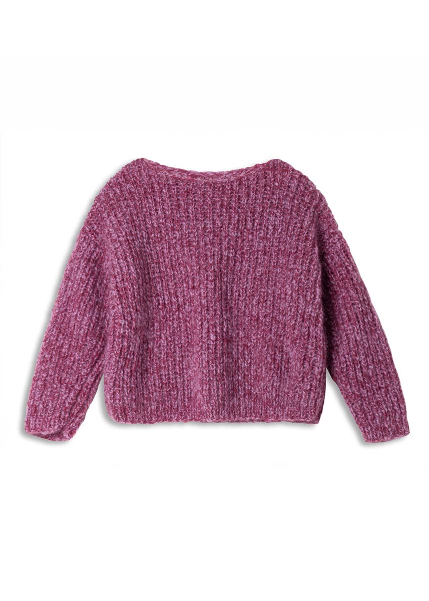 по 250 (300–300–350) г сиренево-розовой (цв. 9) и ягодной (цв. 20) пряжи Mohair Moda (70% мохера кид, 20% шерсти мерино суперфайн, 10% полиамида, 140 м/50 г) фирмы Lana Grossa; прямые спи- цы № 7, крючок № 7