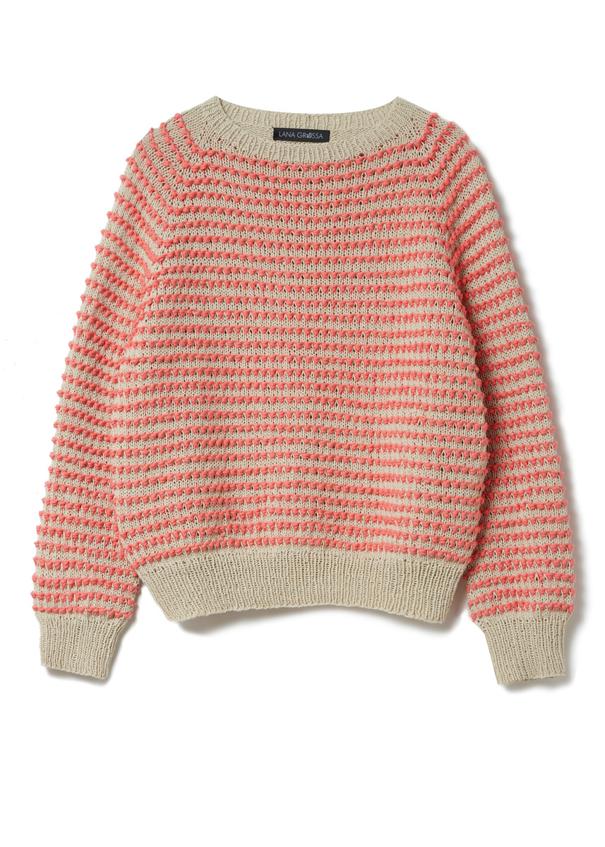 200 (250–250) г ко- ралловой (цв. 3) пряжи Promessa (70% органического хлопка, 30% полиамида восстановленного, 125 м/50 г) и 250 (300–300) г бело-бежевой (цв. 2) пряжи Landlust Sommerseide (50% шелка, 50% хлопка, 170 м/50 г) фирмы Lana Grossa; круговые спицы № 3 длиной 40 и 80 см, круговые спицы № 4 длиной 40, 60 и 80 см, а также 4 красных и 1 синий маркер для петель (МП).