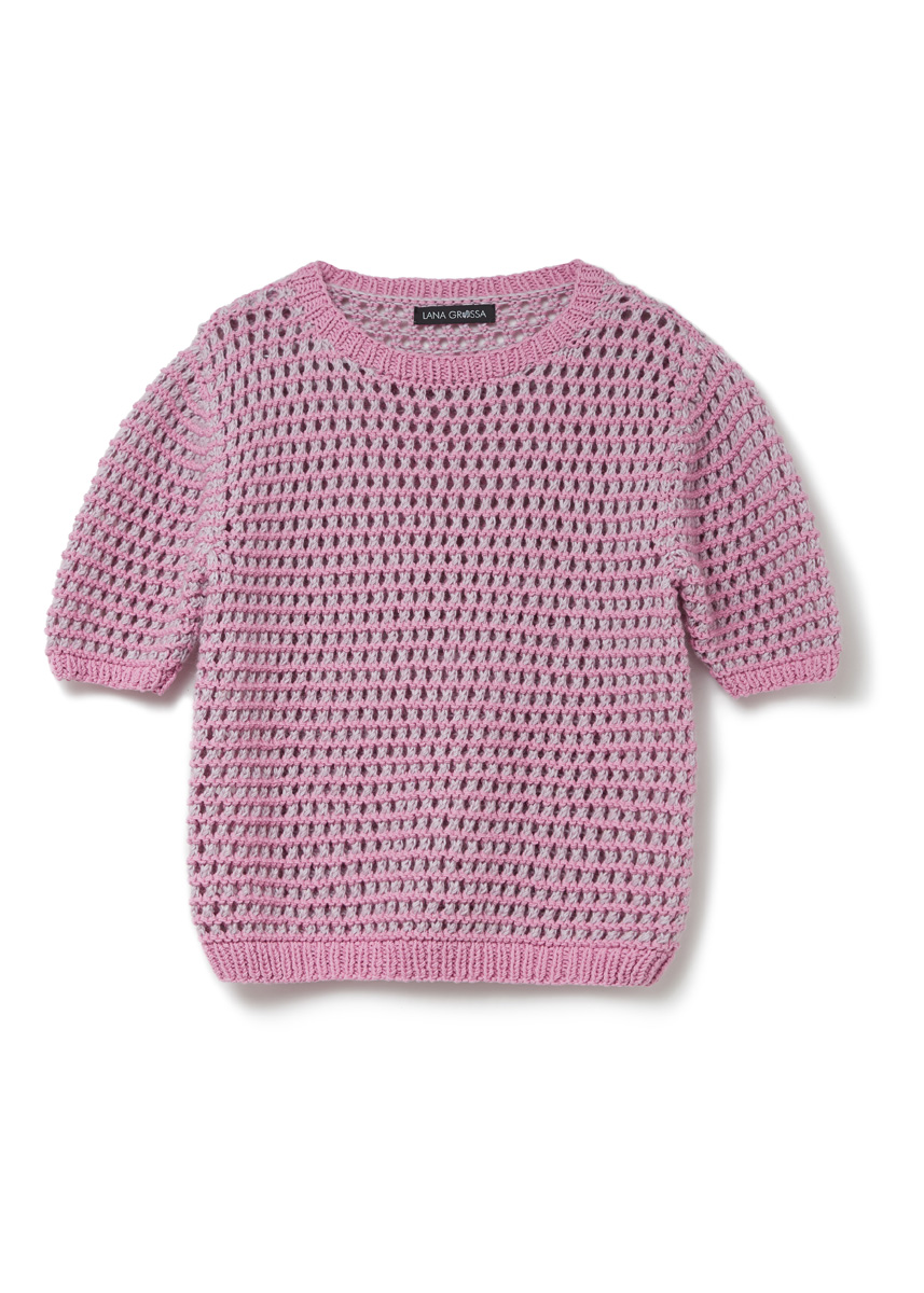 250 (300–350) г цвета гвоздики (цв. 127) пряжи Elastico (96% хлопка, 4% полиэстера (elite), 160 м/50 г) и 200 (250–300) г сиреневой (цв. 8) пряжи Ecopuno (72% хлопка, 17% шерсти мерино, 11% альпа- ка бэби, 215 м/50 г) фирмы Lana Grossa; прямые спицы № 5 и круговые спицы № 5 длиной 40 см.