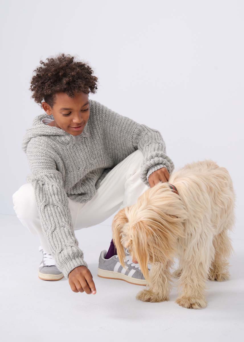 400 (450–500–550) г светло-серой (цв. 13) пряжи Cool Merino (90% шерсти мерино, 10% полиамида, 150 м/50 г) фирмы Lana Grossa; прямые спицы № 5,5 и № 6, короткие круговые спицы № 6, 2 чулочные спицы