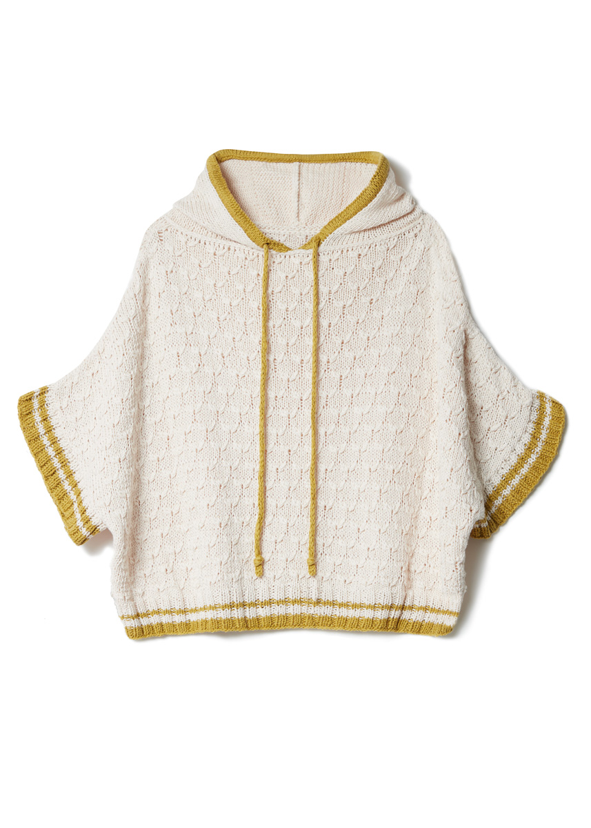 500 (550–600) г кремовой (цв. 2) и 100 г цвета карри (цв. 28) пряжи Dodici (65% хлопка, 25% вискозы, 10% льна, 110 м/50 г) фирмы Lana Grossa; прямые спицы № 5 и круговые спицы № 5 длиной 40 см, крючок № 4, а также 1 вспомогательная спица для кос.