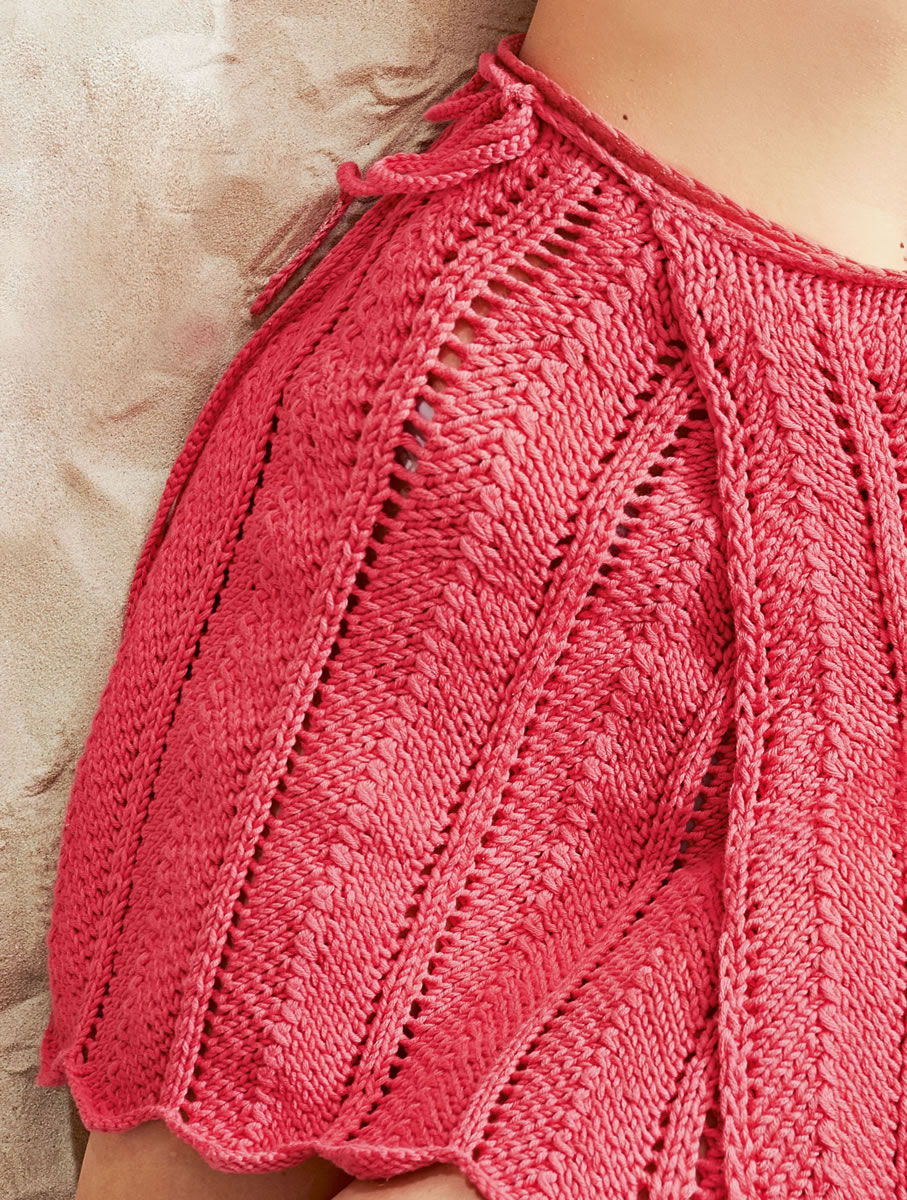 50 г оранжево-красной (цвет 30), по 250 г белой (цвет 1) и цикламеновой (цвет 62), 300 г розовой (цвет 17) пряжи Feltro фирмы Lana Grossa (100 % шерсти, 50 м/50 г); крючок № 7, прямые спицы № 9, набор чулочных спиц № 5.