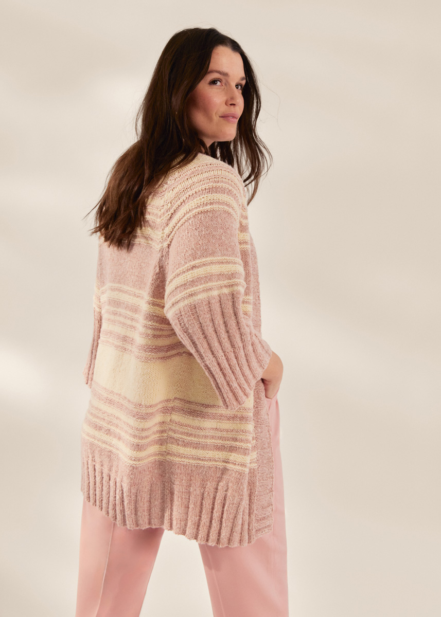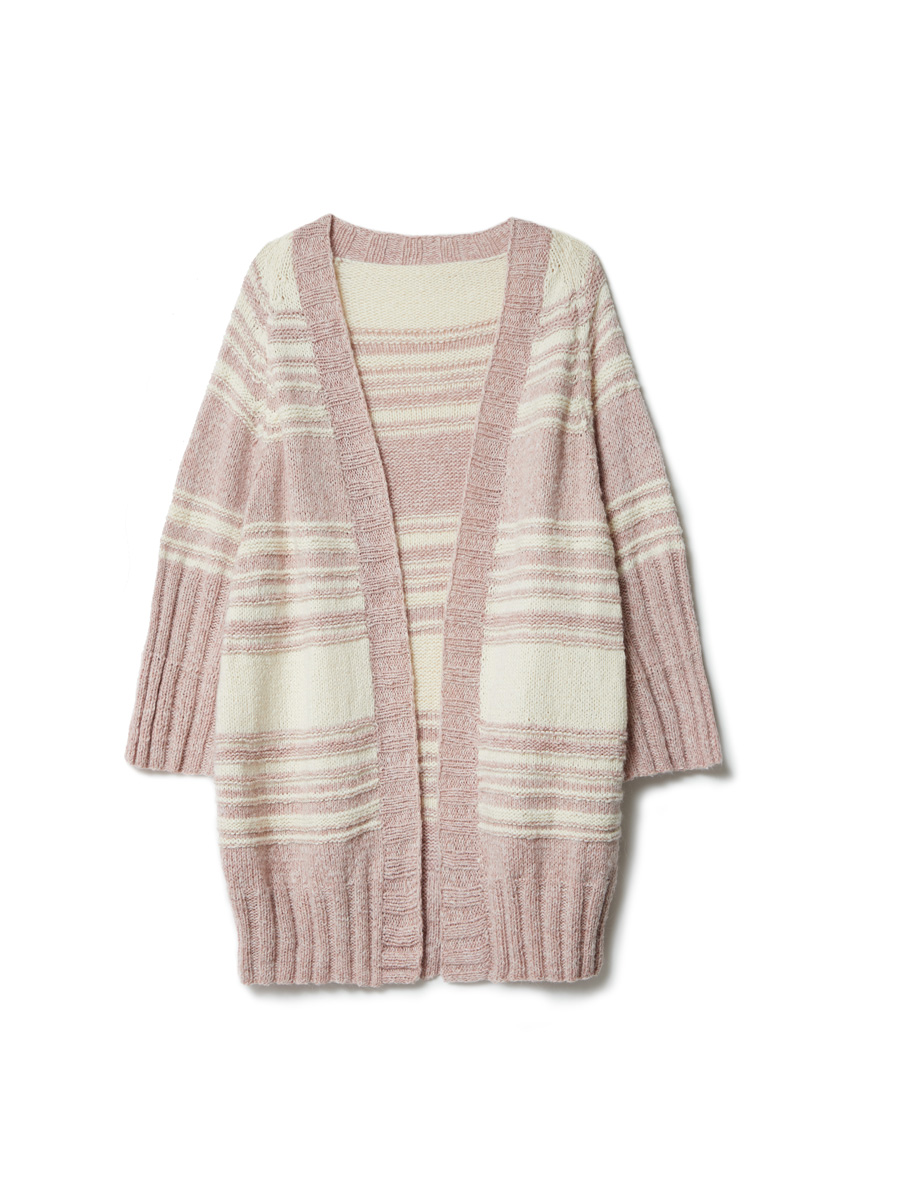 250 (300–350–400) г цвета увяд- шей розовой розы (цв. 7) и 100 (150–150–200) г цвета ванили (цв. 20) пряжи Alta Moda Cotolana (45% шерсти мерино, 45% хлопка пима, 10% полиамида, 150 м/50 г), 75 (100–100–125) г нежно-розовой (цв. 3) и 25 (50–50–75) г белой суровой (цв. 1) пряжи Bella (35% хлопка, 30% полиэстера, 25% альпака бэби, 10% шерсти мерино, 250 м/25 г) фирмы Lana Grossa; прямые спицы № 4 и № 5, а также круговые спицы № 5