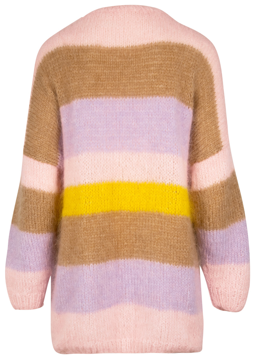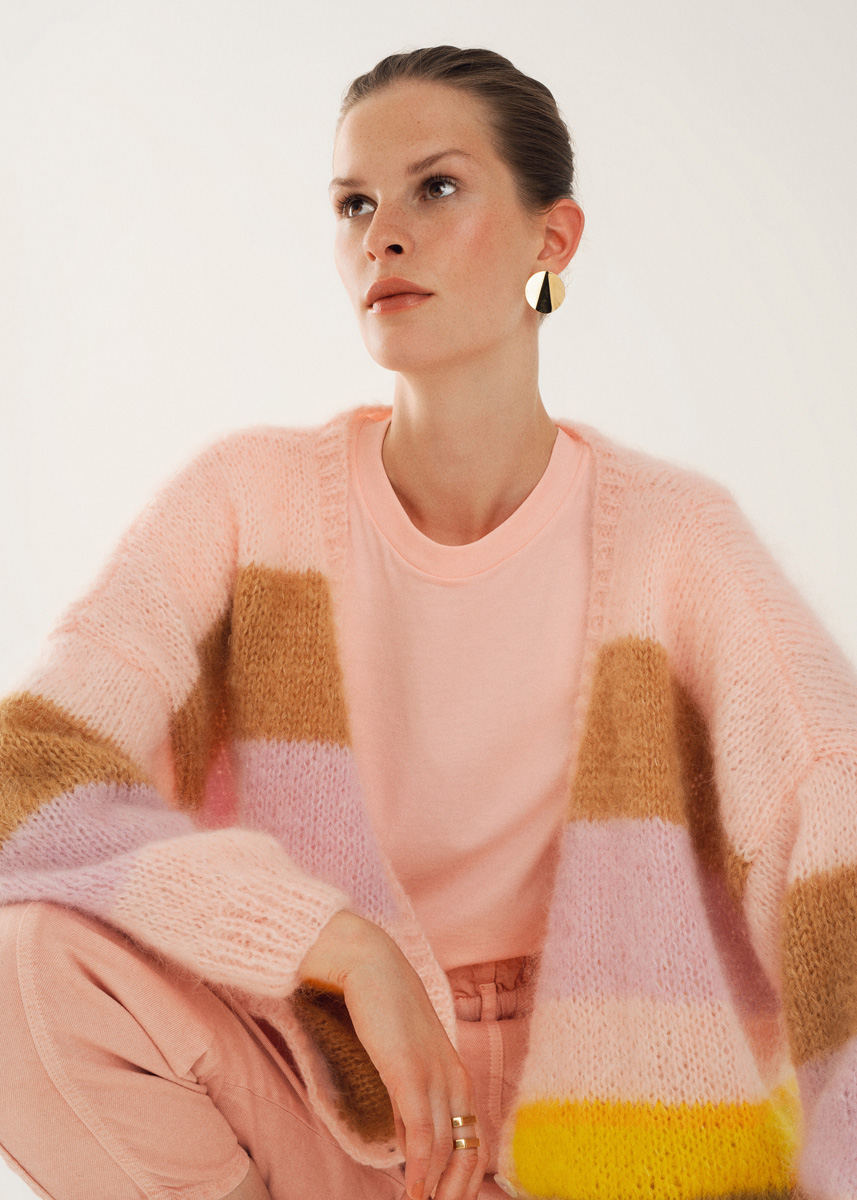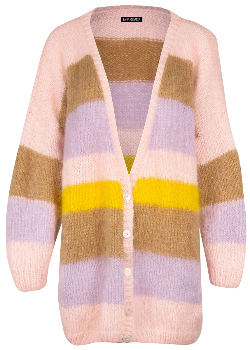 Lana Grossa „Brigitte No. 3“ (40% мохер, 37% шерсть, 23% полиамид; длина нитки 100 m/25 g), 175 (200) г мягко розовый (цв 8), по 125 (150) г легко коричневый (цв 19) и сирень -розовый (цв 7) а так же 25 (50) г жёлтый (цв 1); сп. № 5 и 6, кр. сп. № 5, 80 см длиной; 5 пуговицы с 20 мм диам