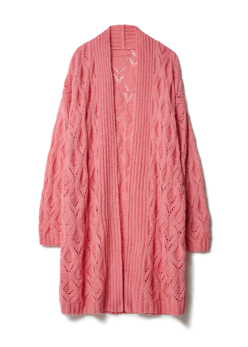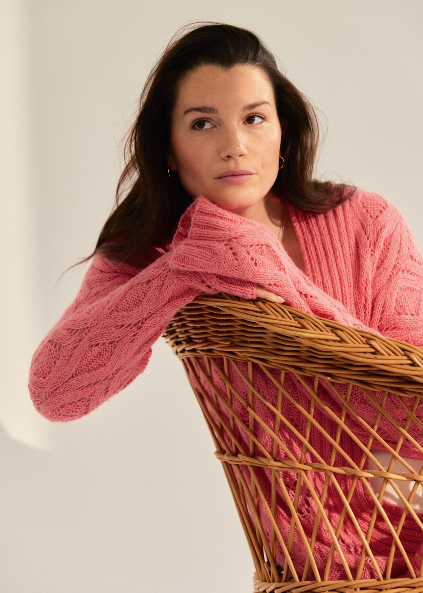 500 (550–650–700) г цвета розо- вой гвоздики (цв. 15) пряжи Campo (65% хлопка, 25% вискозы, 10% льна, 165 м/50 г) и 200 (225–250–275) г конфетно-розовой (цв. 32) пряжи Setasuri (69% альпа- ка сури, 31% шелка, 212 м/25 г) фирмы Lana Grossa; прямые спицы № 4,5 и № 5, крючок № 4.