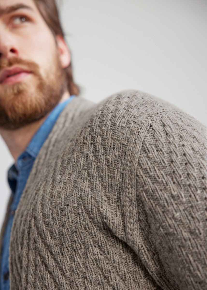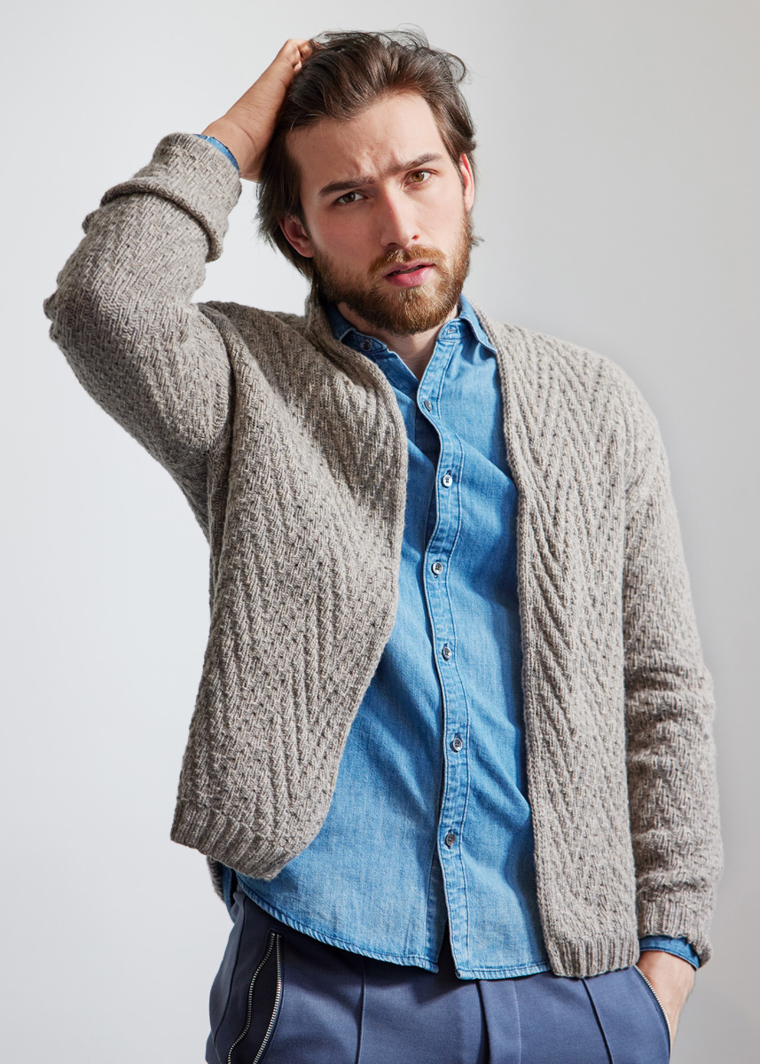 350 (400–450) г серо-коричневой (цв. 7) пряжи Cashmere 16 Fine (80% шерсти, 10% каше- мира, 10% полиамида, 320 м/50 г) фирмы Lana Grossa; прямые спицы № 4